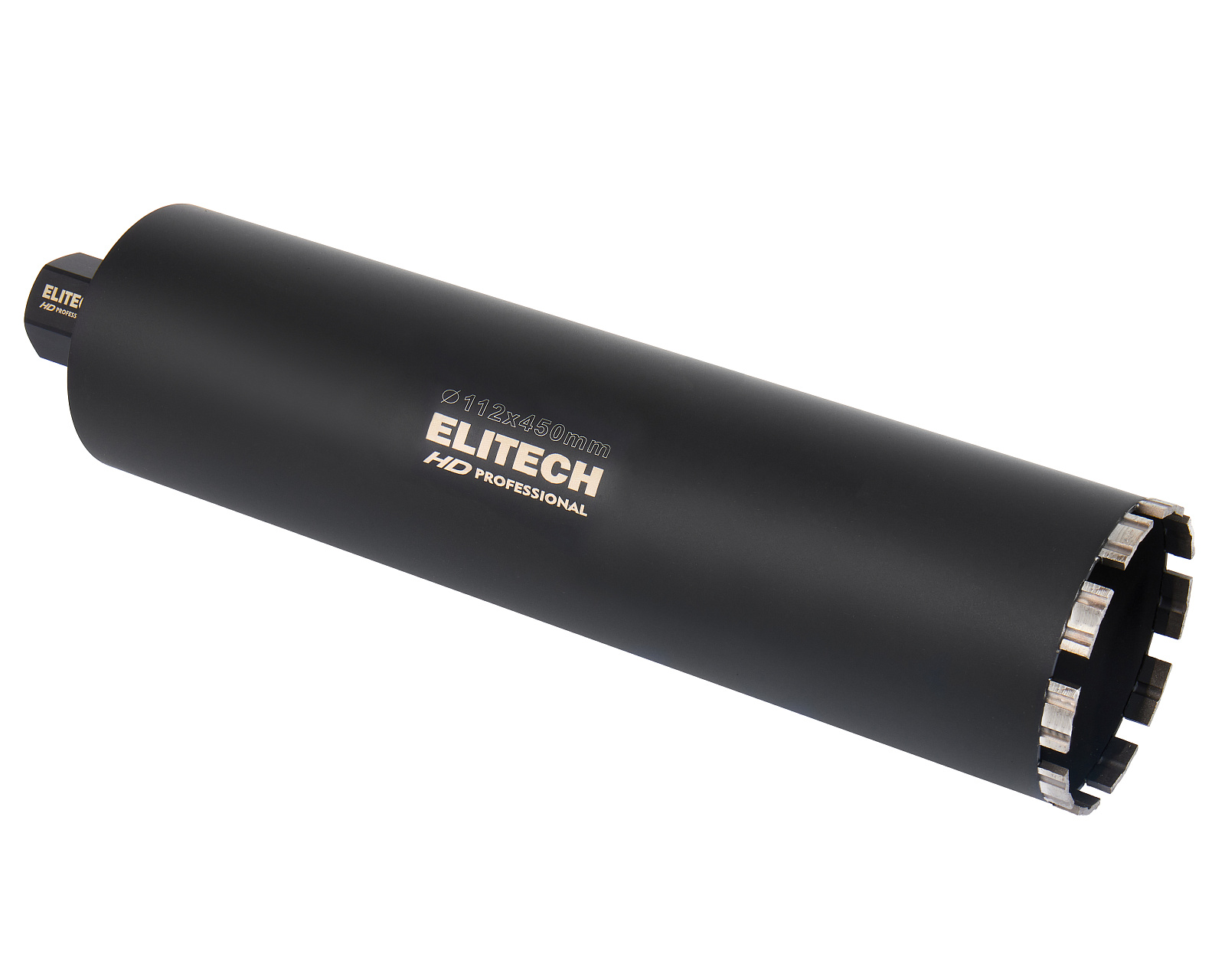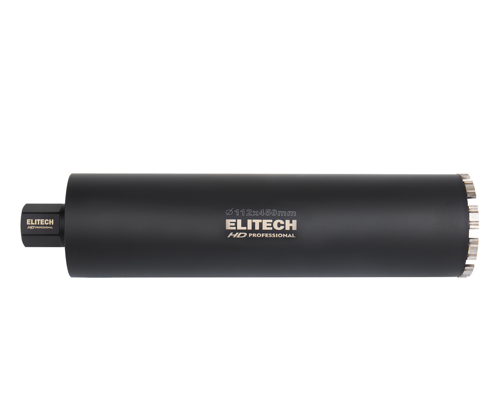 Алмазная коронка диаметром 112 мм и длиной 450 мм с резьбовым креплением 1 1/4' применяется для сверления/бурения с охлаждением твердых материалов, таких как бетон, кирпич, гранит, мрамор, при использовании установок алмазного бурения.