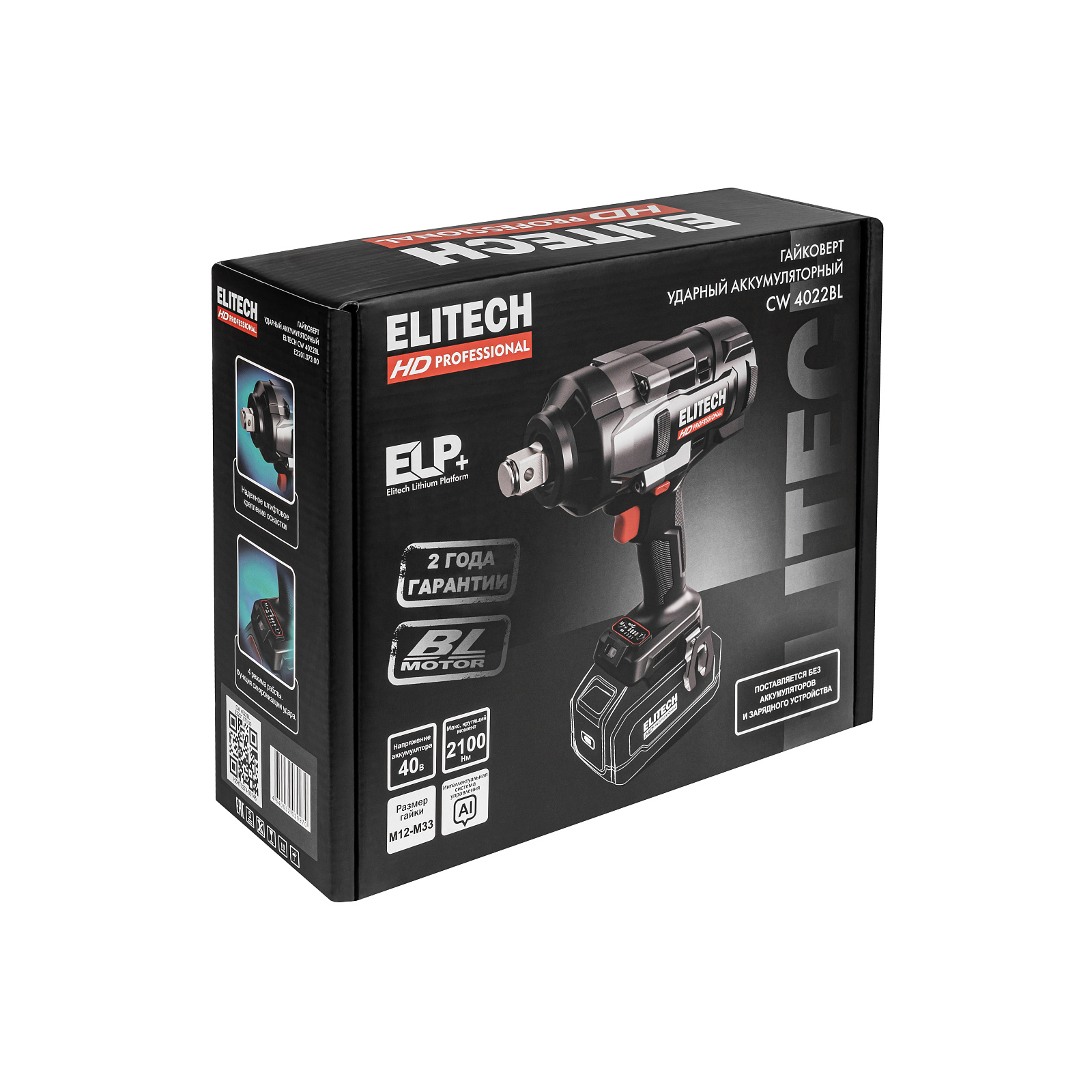 Аккумуляторный гайковерт ELITECH HD CW 4022BL (E2201.073.00) с безщеточным электродвигателем напряжением 40 В, предназначен для работы с резьбовым крепежом (болты и гайки). Он обеспечивает высокий крутящий момент – до 2300 Нм при откручивании высоконагруженных и закисших резьбовых соединений.
