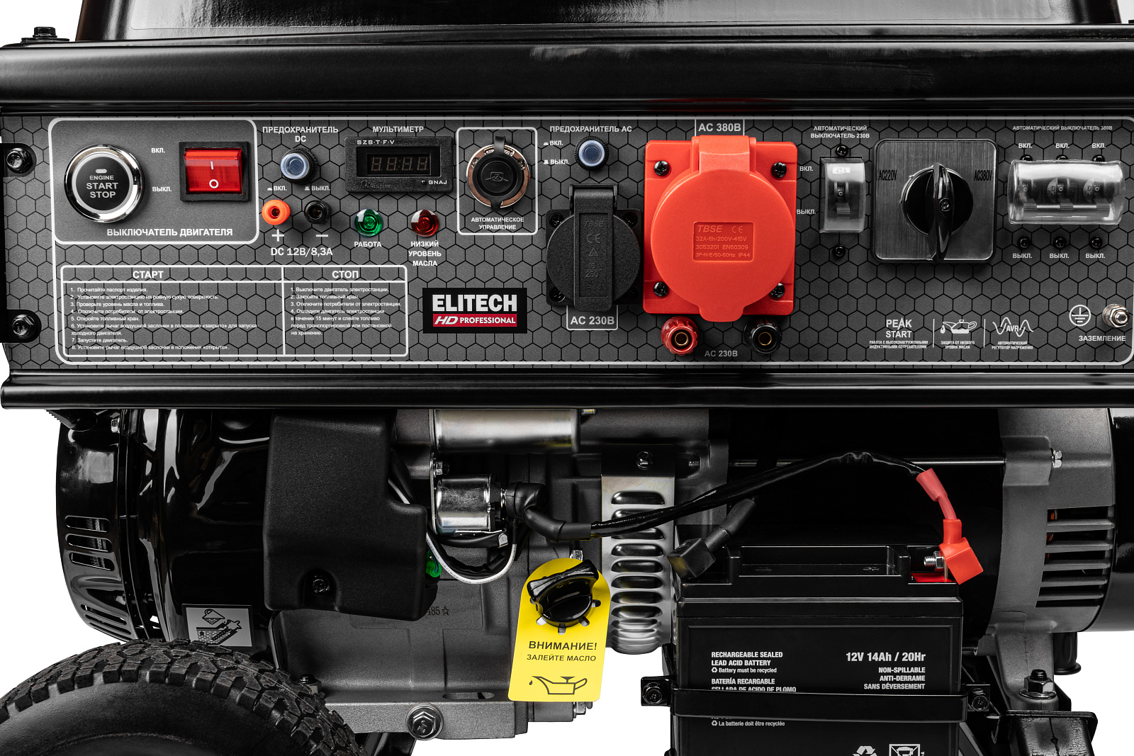 - PEAK START – работа с высоконагруженными индуктивными потребителями. Позволяет кратковременно выдерживать пусковые токи, в 2,5 раза превышающие номинальную мощность электростанции.- Мультиметр - цифровой прибор на панели управления электростанции, который отображает 3 показателя: выходное напряжение, частоту, моточасы.