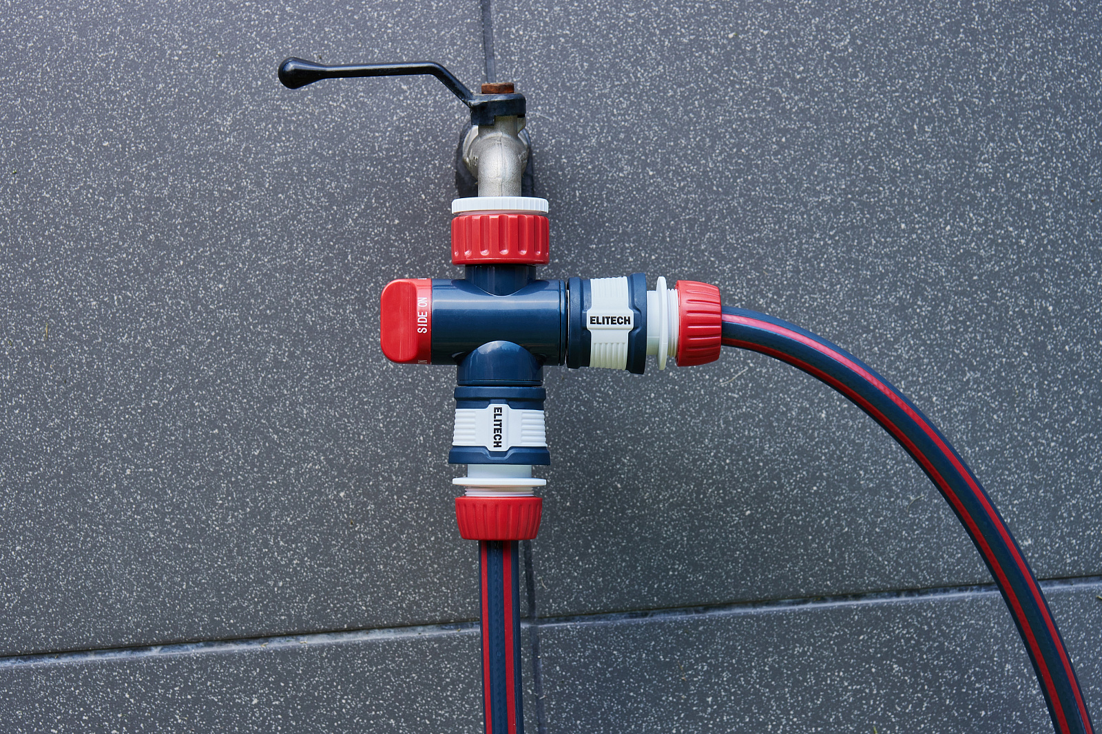 **Адаптер двухканальный HF 027 Elitech Garden** используется для подключения двух шлангов к стационарным водным магистралям (краны, водные розетки)