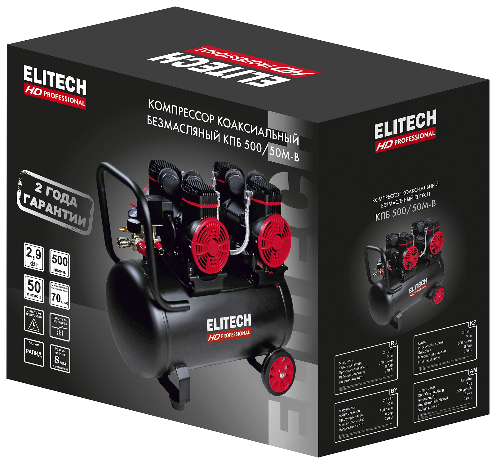 Коаксиальный безмасляный малошумный компрессор с ресивером на 50 литров. Два выхода. Быстросъемный разъем рапид и елочка 8мм с вентилем. Регулировка давления на выходе. Два асинхронных двигателя. Четыре поршневых блока. Два манометра для контроля давления в ресивере и на выход.