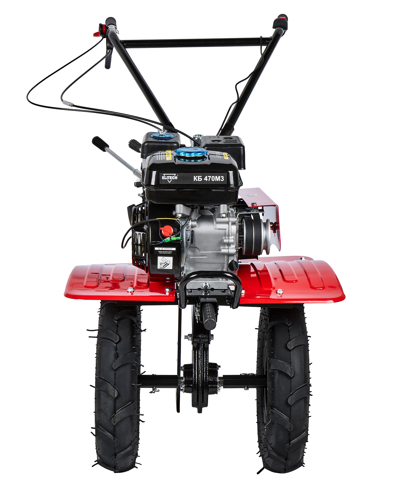 Мотоблок КБ 470М3 оснащен бензиновым 4-тактным двигателем мощностью 7 л.с. и коробкой передач 3 скорости вперед /1 назад. Поставляется в комплекте с пневматическими колесами. Мотоблок имеет задний фаркоп для крепления навесного оборудования (плуг, окучник, картофелевыкапыватель, прицепа-тележки). Для работы с данным навесным оборудованием необходимо дополнительно установить на мотоблок грунтозацепы. И передним валом для установки и работы с активным навесным оборудованием (роторная косилка, щетка и т.п.), приводимым в действие через шкив отбора мощности.