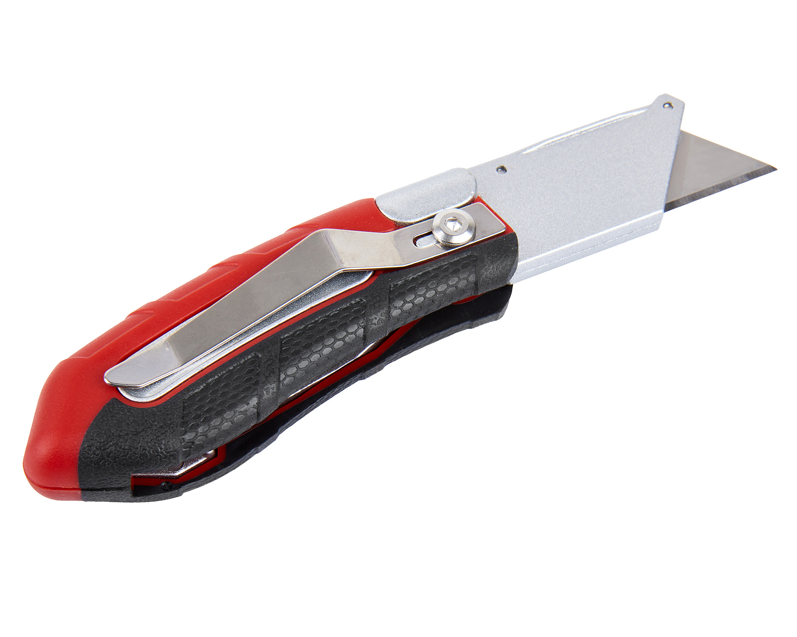 Строительный складной нож с трапециевидным лезвием и рукояткой из цинкового сплава с TPR-покрытием.
