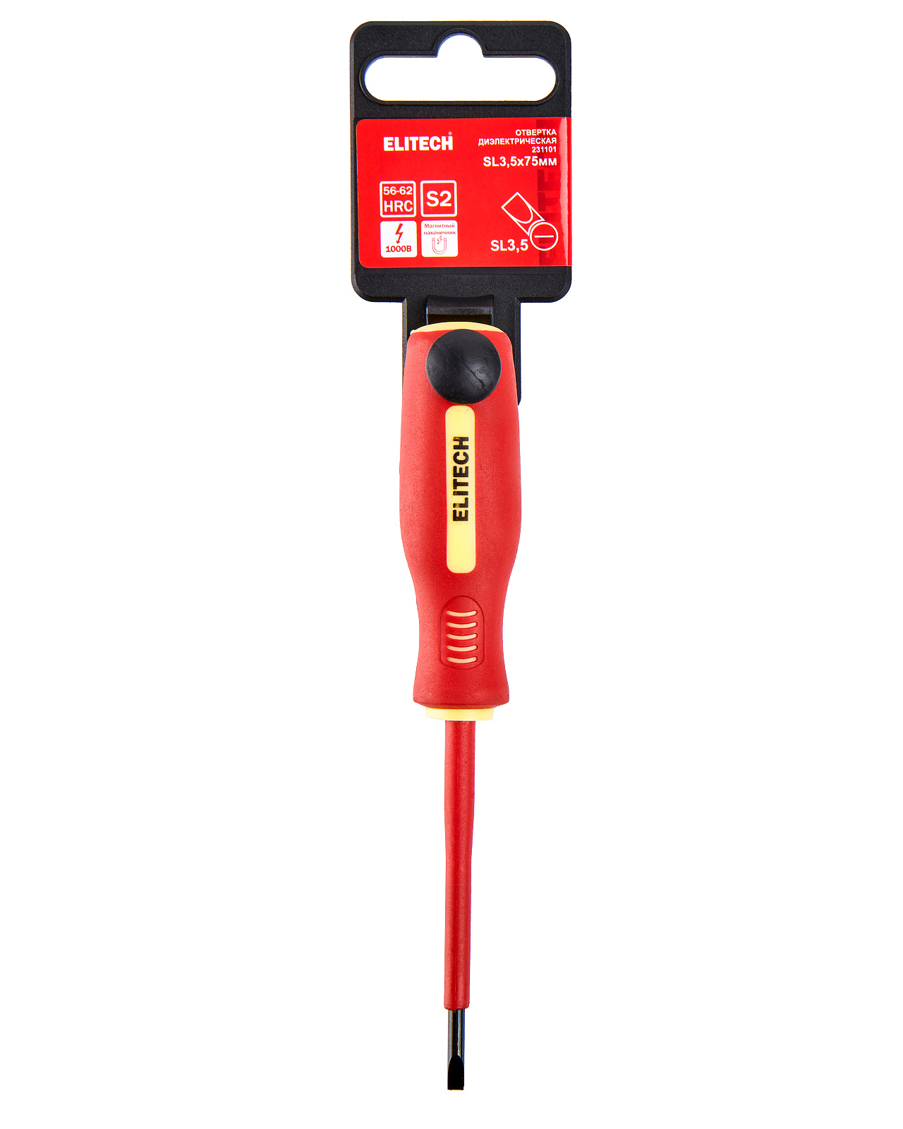 Отвертка диэлектрическая SL3,5x75мм. Наконечник отвертки намагниченный и имеет плоскую форму шлица (SL) шириной 3,5 мм. Длина рабочей части стержня 75 мм. Стержень выполнен из стали S2, которая обладает высокой прочностью и твердостью. Отвертка имеет диэлектрическую ручку и диэлектрическое покрытие стержня, которое выдерживает напряжение до 1000В переменного тока.