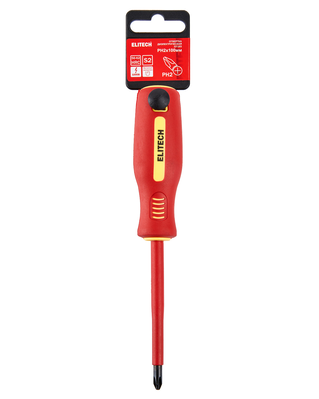 Отвертка диэлектрическая PH2x100мм. Наконечник отвертки намагниченный и имеет крестообразную форму шлица (PH). Длина рабочей части стержня 100 мм. Стержень выполнен из стали S2, которая обладает высокой прочностью и твердостью. Отвертка имеет диэлектрическую ручку и диэлектрическое покрытие стержня, которое выдерживает напряжение до 1000В переменного тока.