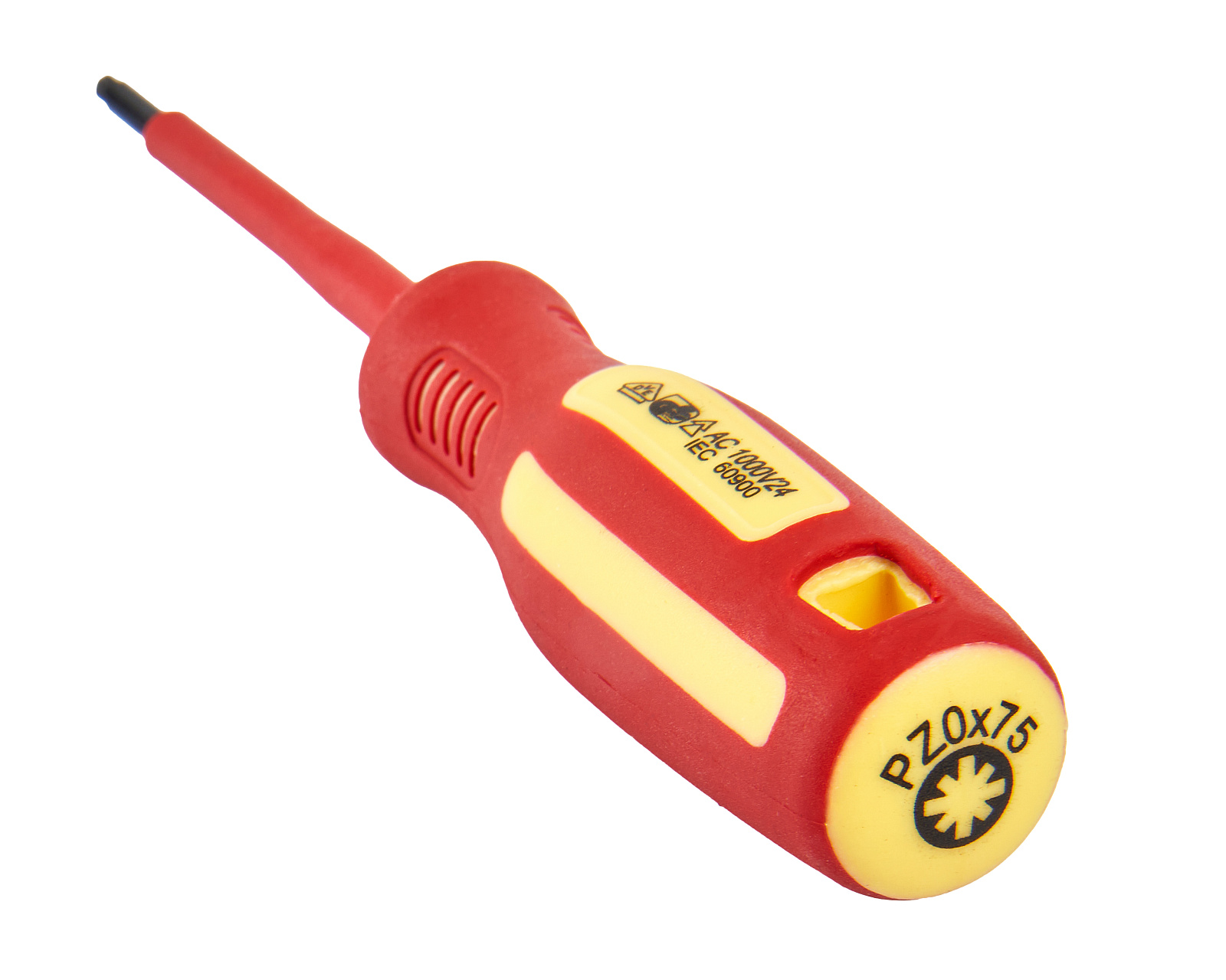 Отвертка диэлектрическая PZ0x75мм. Наконечник отвертки намагниченный и имеет крестообразную форму шлица (PZ). Длина рабочей части стержня 75 мм. Стержень выполнен из стали S2, которая обладает высокой прочностью и твердостью. Отвертка имеет диэлектрическую ручку и диэлектрическое покрытие стержня, которое выдерживает напряжение до 1000В переменного тока.