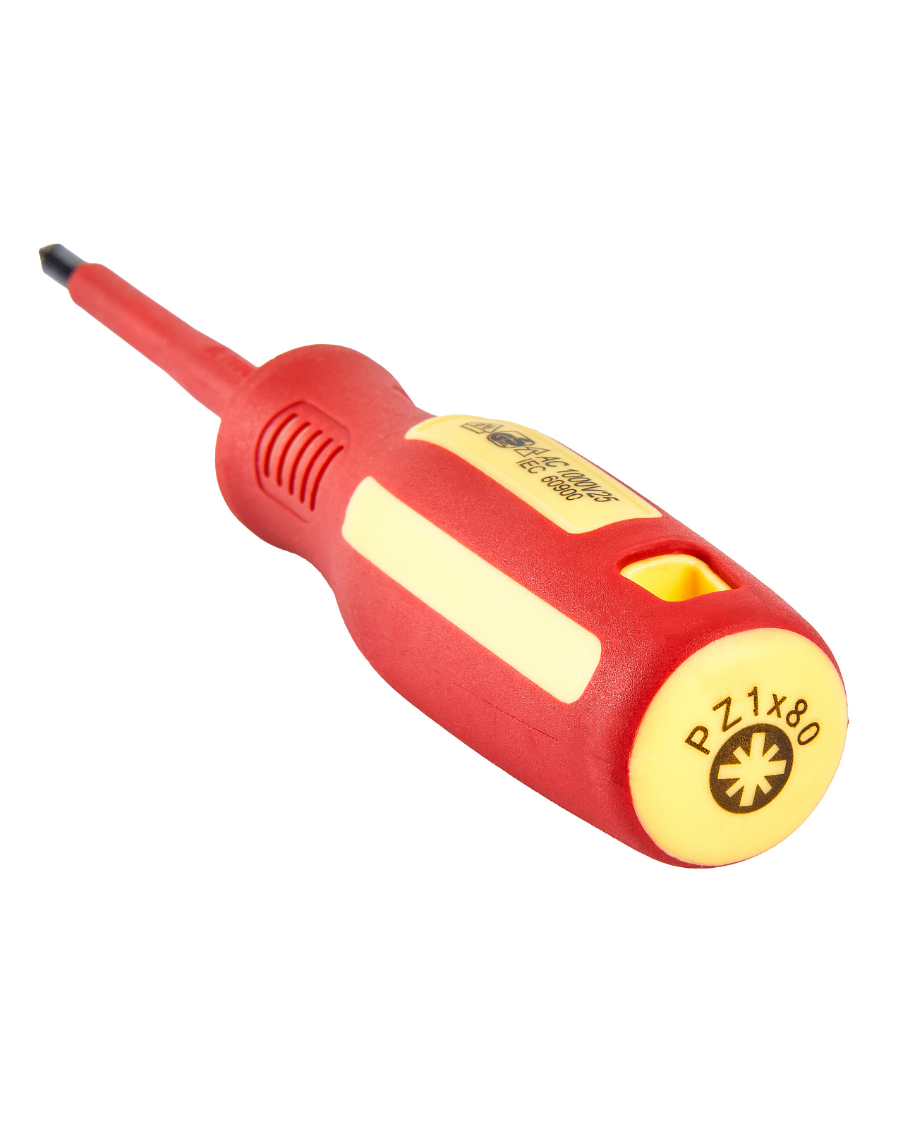 Отвертка диэлектрическая PZ1x80мм. Наконечник отвертки намагниченный и имеет крестообразную форму шлица (PZ). Длина рабочей части стержня 80 мм. Стержень выполнен из стали S2, которая обладает высокой прочностью и твердостью. Отвертка имеет диэлектрическую ручку и диэлектрическое покрытие стержня, которое выдерживает напряжение до 1000В переменного тока.