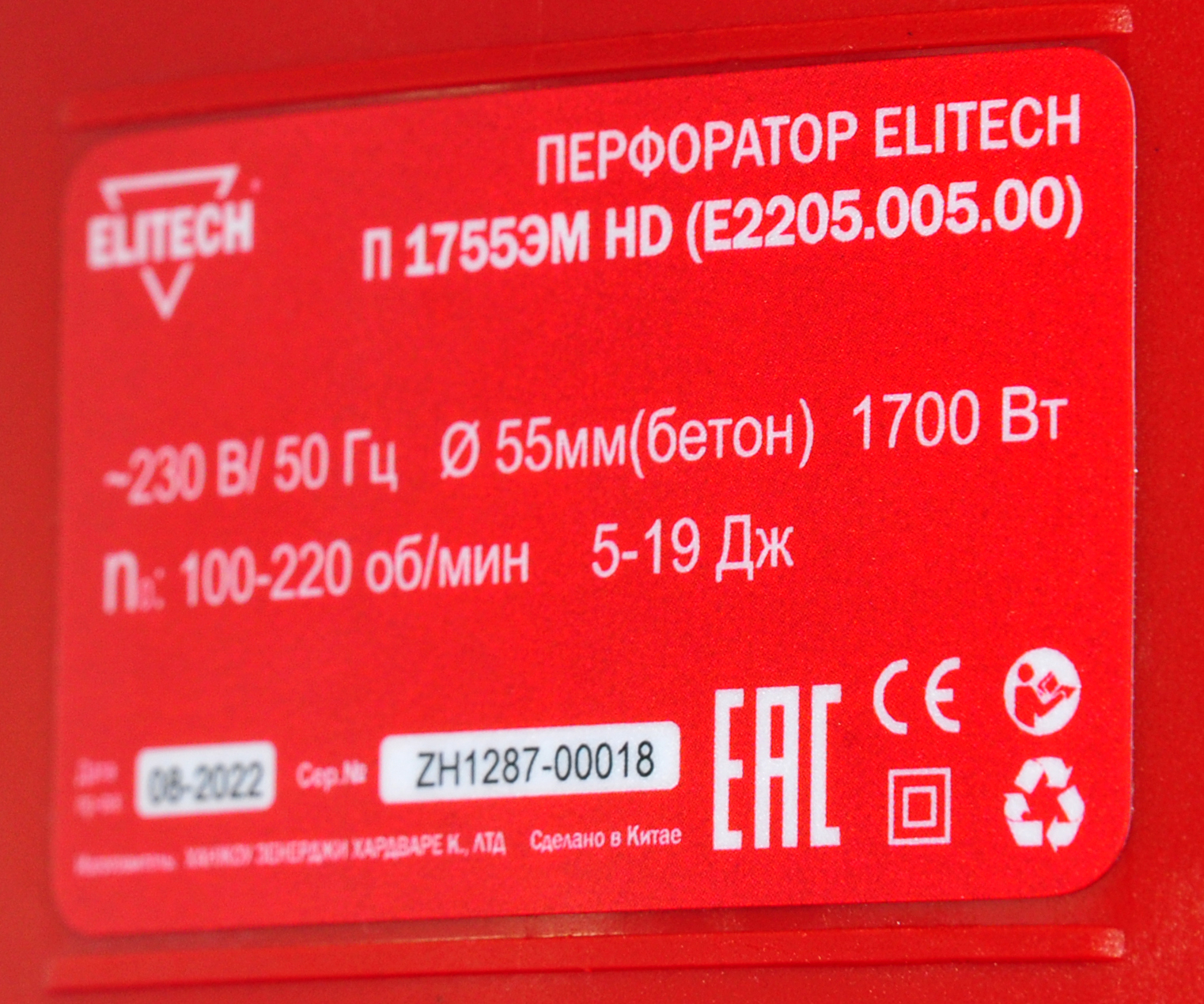 Перфоратор П 1755ЭМ HD (E2205.005.00). Тип патрона SDS-max. Мощность 1700Вт. Количество режимов 2 (сверление с ударом, отбойный молоток). Регулировка положения зубила (12 положений). Регулировка оборотов двигателя. Энергия удара 5-19Дж. Предназначен для работы с буром, диаметром до 55мм и коронкой, диаметром до 150мм. Вертикальное расположение двигателя. Антивибрационная система. Индикатор износа щеток двигателя. Индикатор включения в сеть.