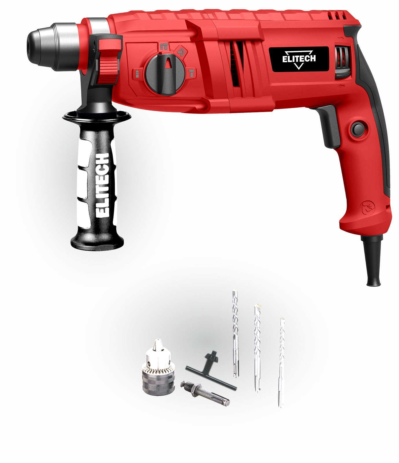 Перфоратор ELITECH П 240РЭМ (E2205.043.01) мощностью 750 Вт, со скоростью вращения 0-1850 об/мин, энергией ударов 2,3 Дж и их частотой 0-6000 уд/мин, предназначен для бурения отверстий и разрушения твердых материалов, таких как кирпич, бетон, природный и искусственный камень и т.п. Для работы с перфоратором могут использоваться насадки с хвостовиком SDS-plus – буры диаметром до 24 мм, зубила различных форм (пила, лопатка). Инструмент имеет три режима работы - дрели (для сверления дерева, металла и других материалов, не требующих ударного воздействия), перфоратора (основной режим для сверления бетона) и режим отбойного молотка (для разрушения материалов различными видами зубила).