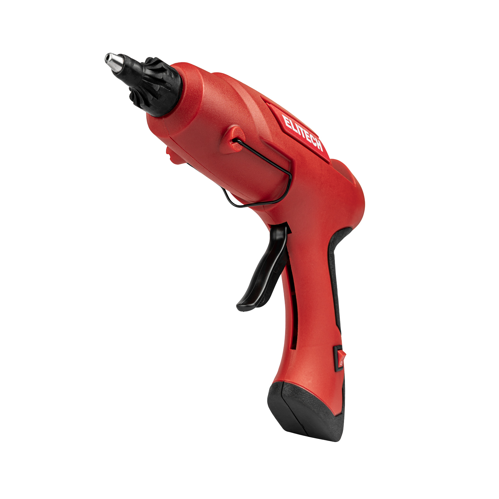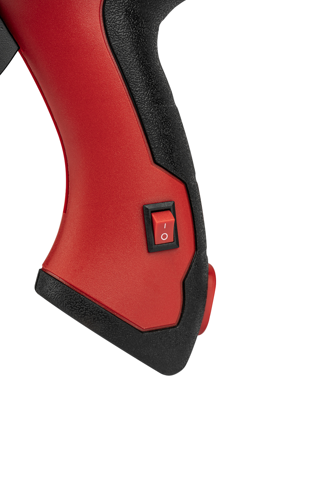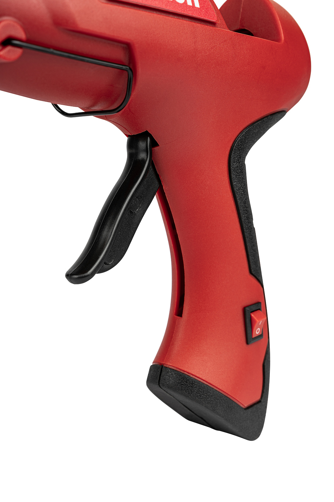 Термоклеевой пистолет мощностью 200 Вт, производительностью 10-14 г/мин. и временем нагрева 3-5 минут, предназначен для быстрой фиксации и склеивания (180°С), чистых, сухих и обезжиренных материалов – дерева, пластмасс, картона, стекла, керамики, камня, ткани, пробки, кожи, металла, термоплавким клеем с диаметром стержня 11,2 мм.