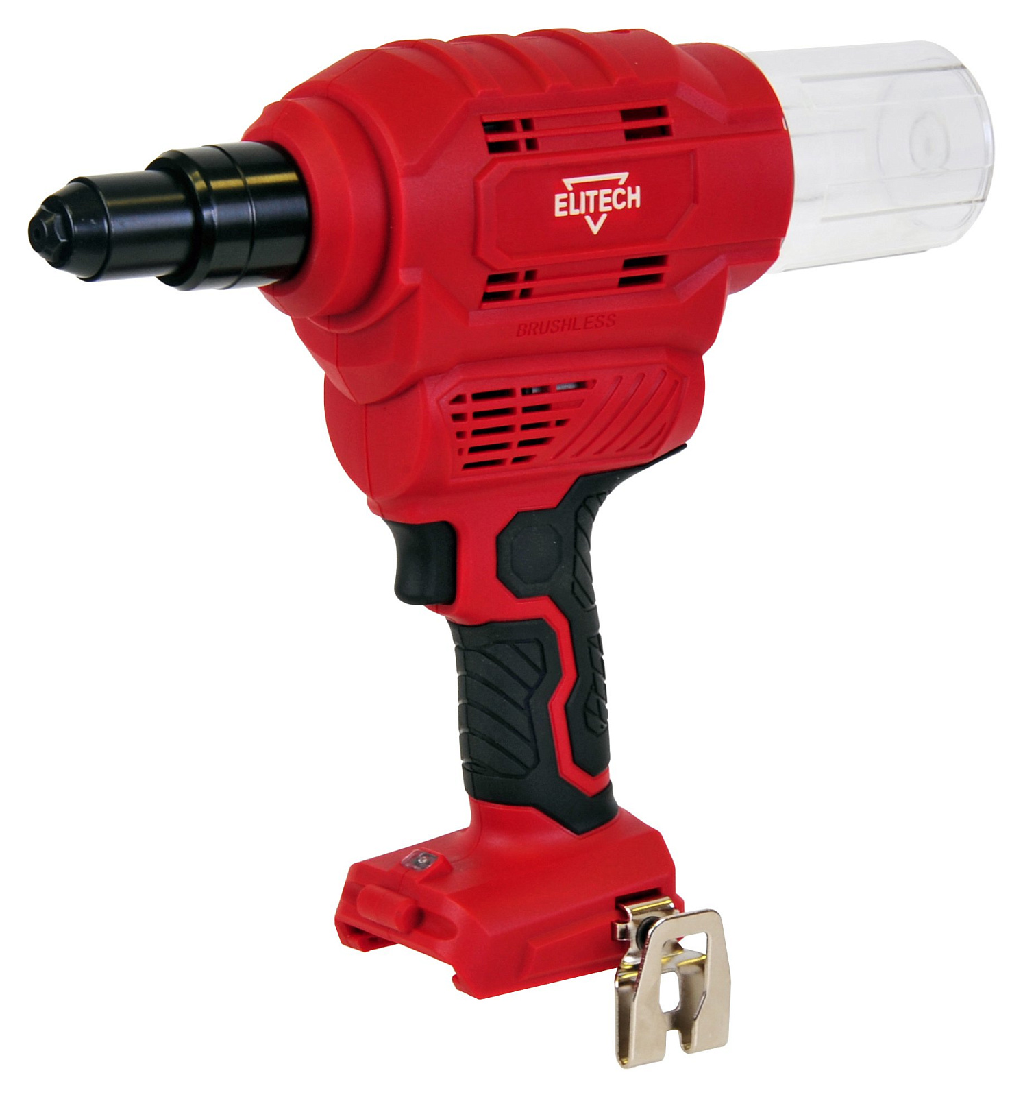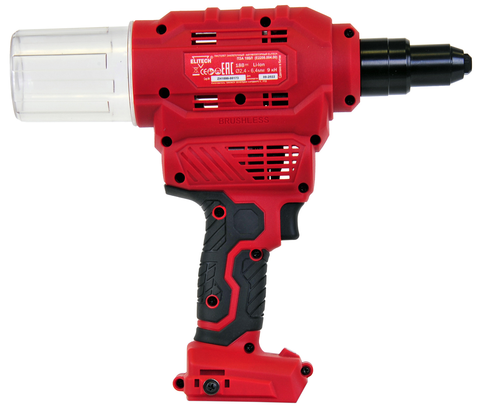 Пистолет заклёпочный аккумуляторный ELITECH ПЗА 18БЛ (E2208.004.00) предназначен для установки стандартных вытяжных заклепок из любого материала, диаметром от 2,4 до 6,4 мм.