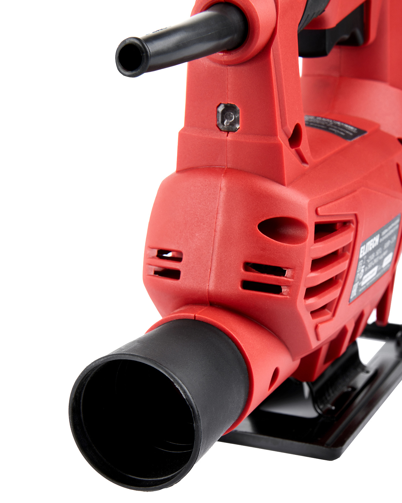 Инструмент обладает следующими функциями: регулировка скорости, регулировка наклона полотна в обе стороны до 45 градусов, возможность подключения пылесоса.