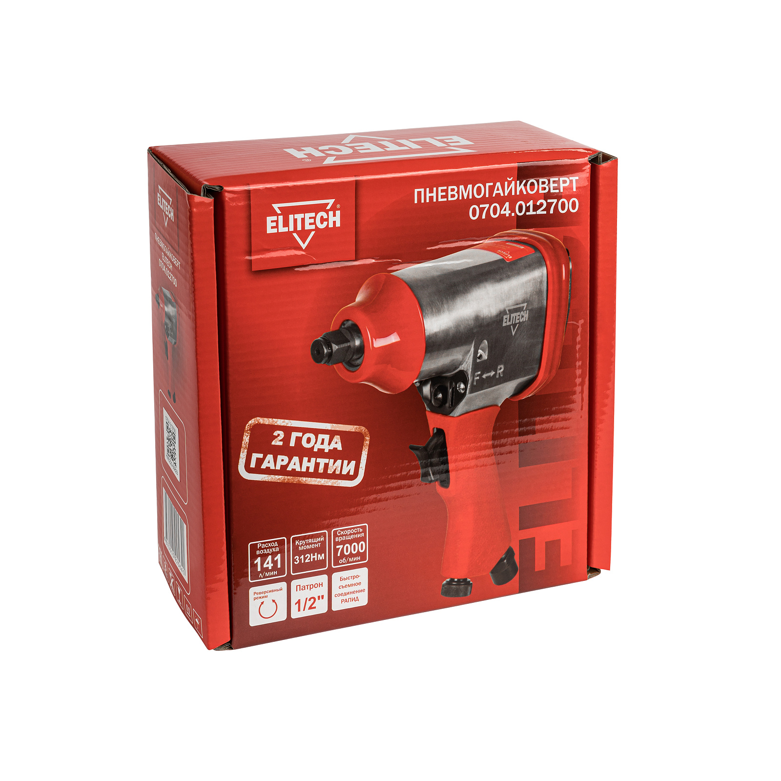 Пневмогайковерт Elitech 0704.012700 предназначен для работы с резьбовым крепежом размером до М14 высокой прочности и до М22 стандартной прочности. Вал гайковерта имеет посадку квадрат 1/2 дюйма, в качестве рабочей оснастки используются ударные головки с посадкой 1/2 дюйма. Инструмент имеет 4 фиксированные значения крутящего момента, выставляемые с помощью регулятора на ручке. Максимальный крутящий момент 312 Нм. Скорость вращения 7000 об/мин. Есть реверс. Для работы пневмогайковерта необходимо использовать воздушный компрессор с производительностью на выходе не менее 141 л/мин при давление 6,3 бар, с установленным на выходе лубрикатором (масленкой). Металлический корпус, низкая пожароопасность. Комплектация : пневмогайковерт, переходник 1/4'' - рапид, руководство по эксплуатации. Габариты 190 х 68 х 200 мм, масса 2,1 кг.