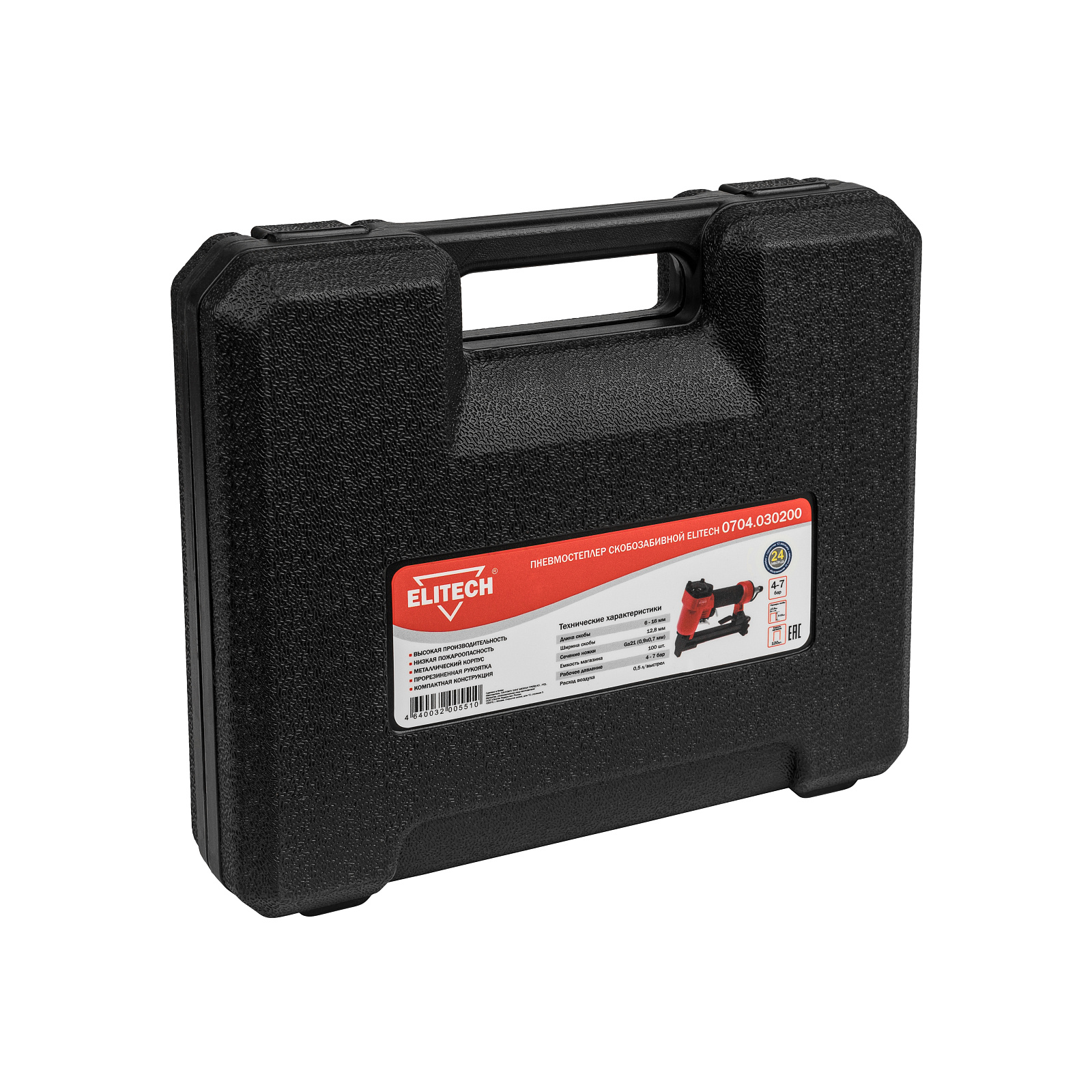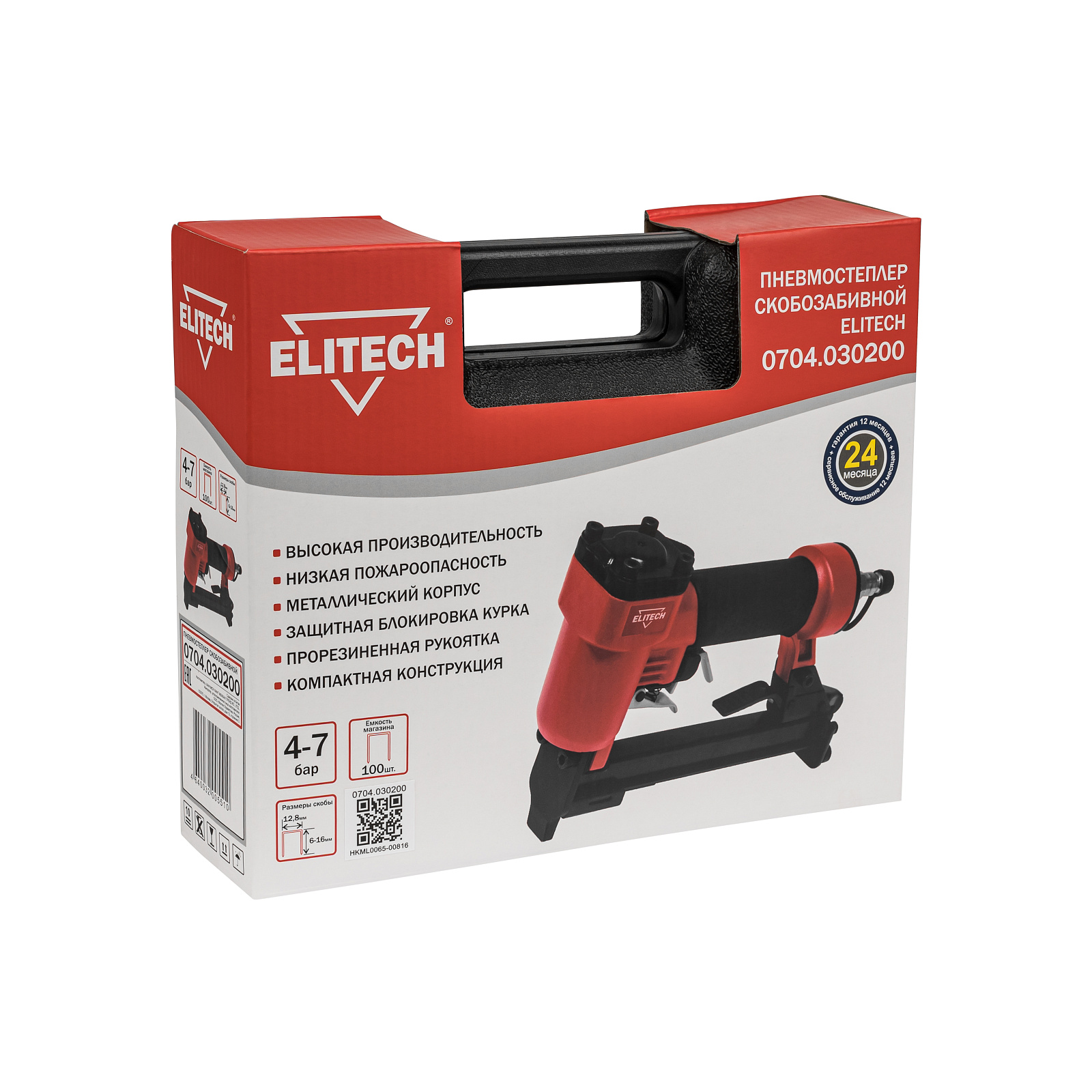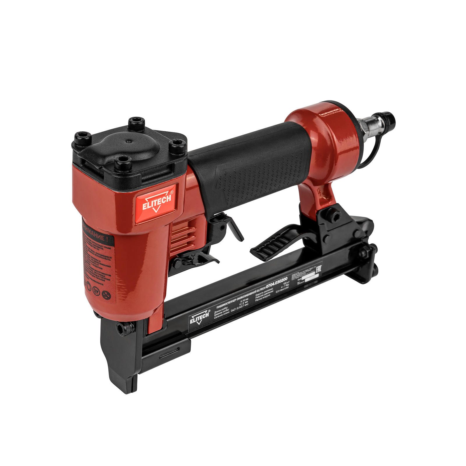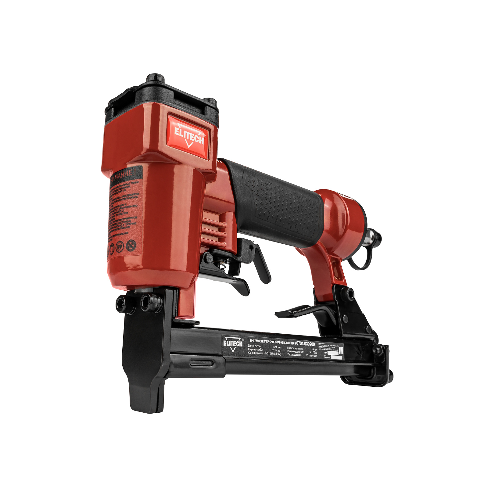 Пневмостеплер скобозабивной 0704.030200 для работы использует сжатый воздух от компрессора давлением от 4 до 7 бар. Степлер используется для крепления гипсокартона, утеплителя, фанеры и прочего. В качестве оснастки применяются скобы размером 6-16 мм. Вместимость магазина составляет 100 штук. Скобы - тип 80.