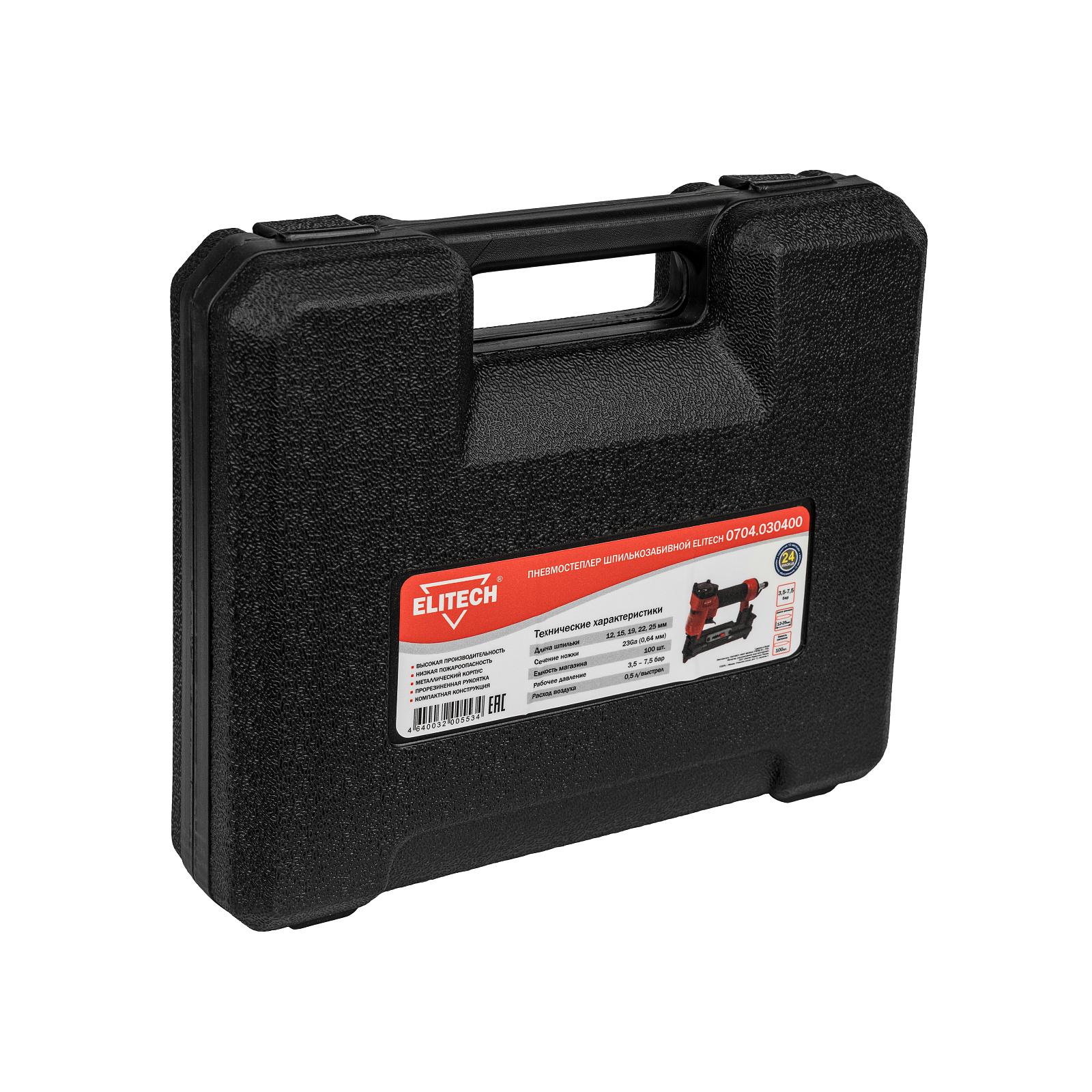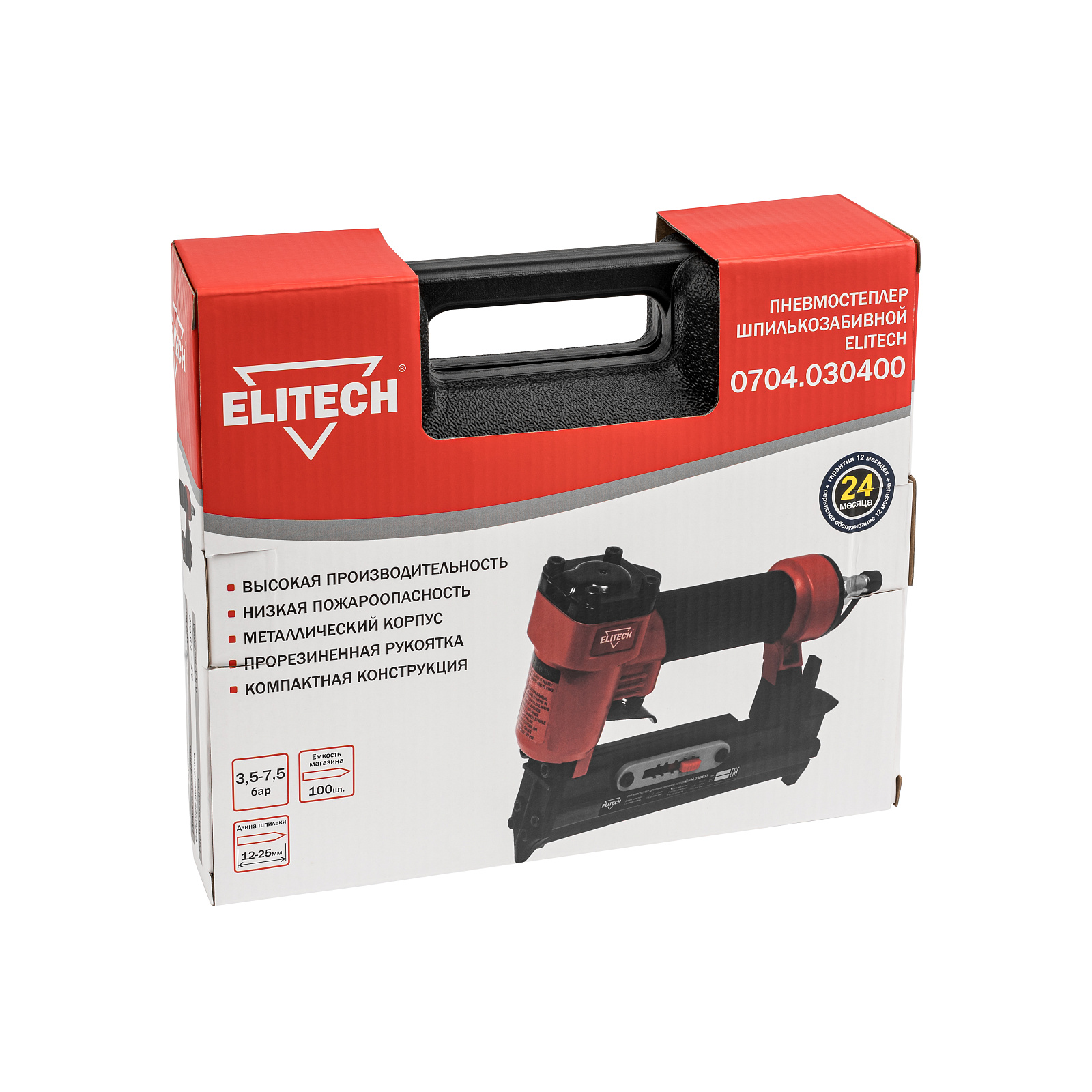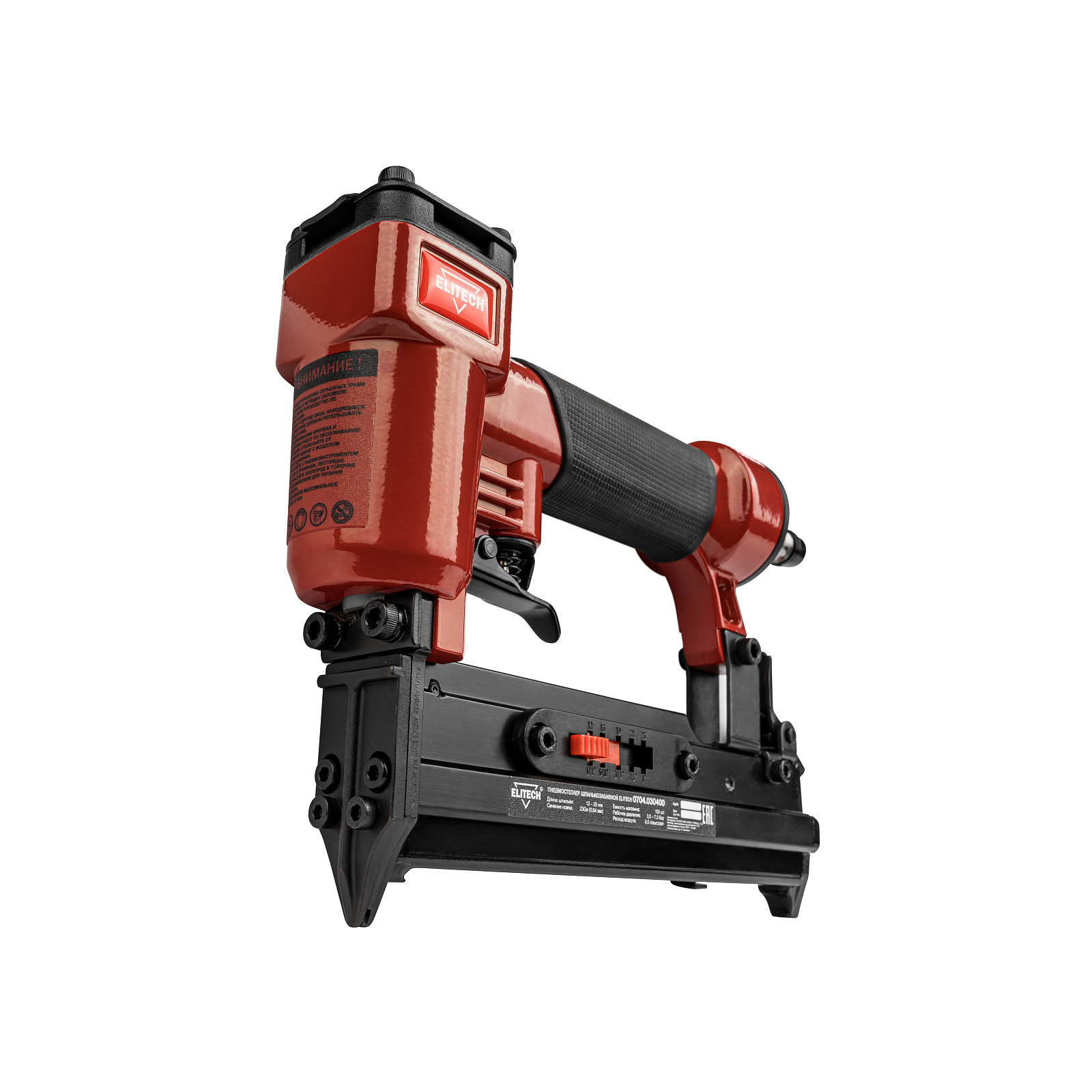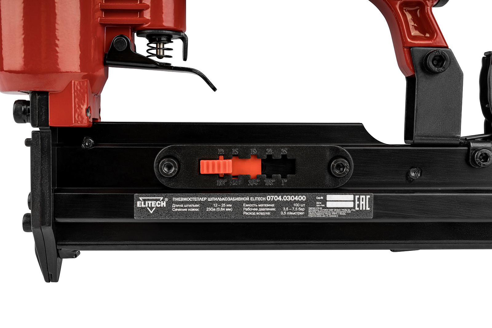 Пневмостеплер шпилькозабивной 0704.030400 для работы использует сжатый воздух от компрессора давлением от 3,5 до 7,5 бар. Пневмостеплер используется для креплени декоративных изделий, наличников, дверных доборов, плинтусов. В качестве оснастки применяются шпильки длиной 12, 15, 19, 22, 25 мм. Шпилька относится к финишному крепежу и практически не оставляет следов крепления на материале. Вместимость магазина составляет 100 штук.