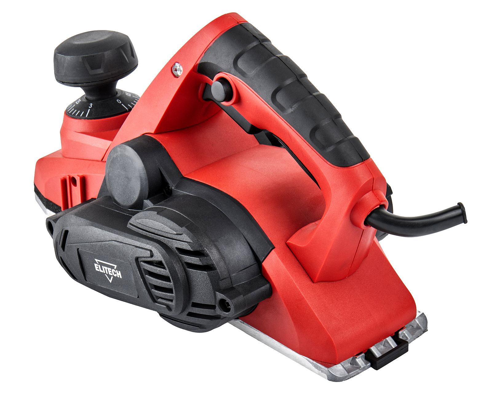 Патрубок для подключения пылесоса обеспечивает сбор стружки в пылесос или выброс в сторону. Плавная регулировка глубины строгания осуществляется путем поворота опорной ручки. Кнопка блокировки случайного включения делает работу оператора безопасной.