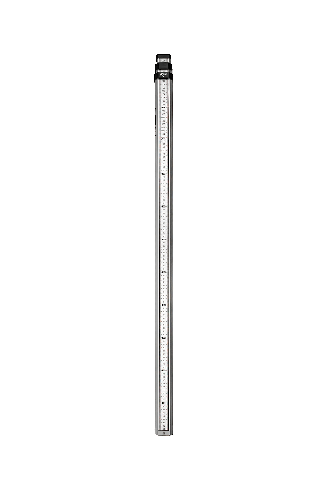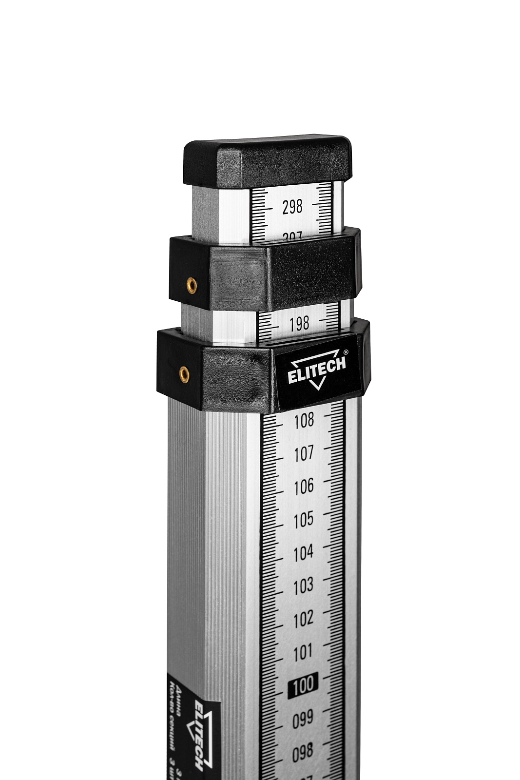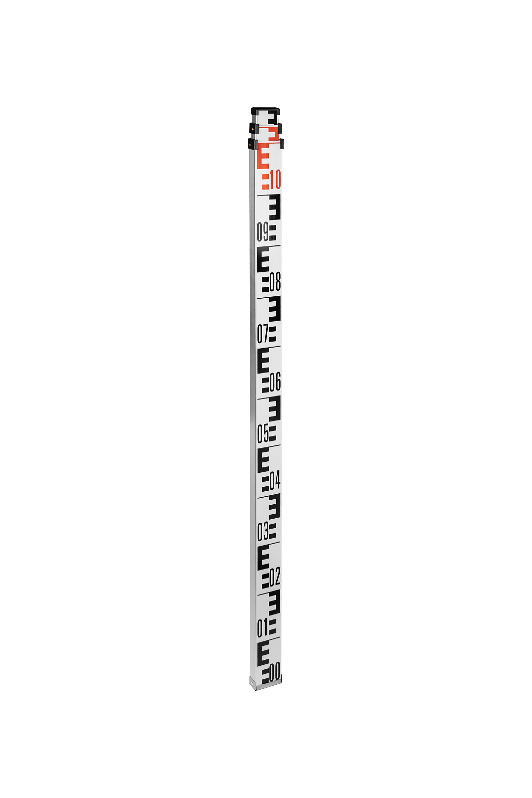 Данная телескопическая рейка на оборотной стороне имеет пять секций, на каждой из которых нанесена миллиметровая шкала снизу до верху. На лицевой стороне расположена шкала «Е», которая обозначена черно/красным цветом.