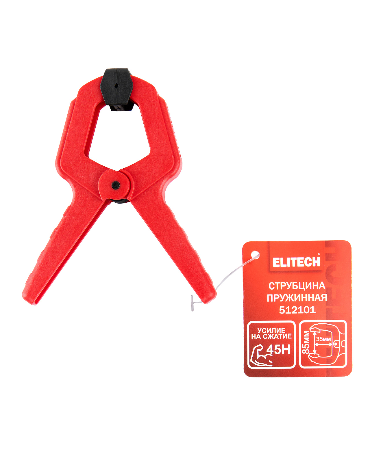 Пружинная пластиковая струбцина ножничного типа с плоскими поворотными губками, с силой зажима 45 Н (4,5 кг), используется для быстрой фиксации деталей и заготовок.