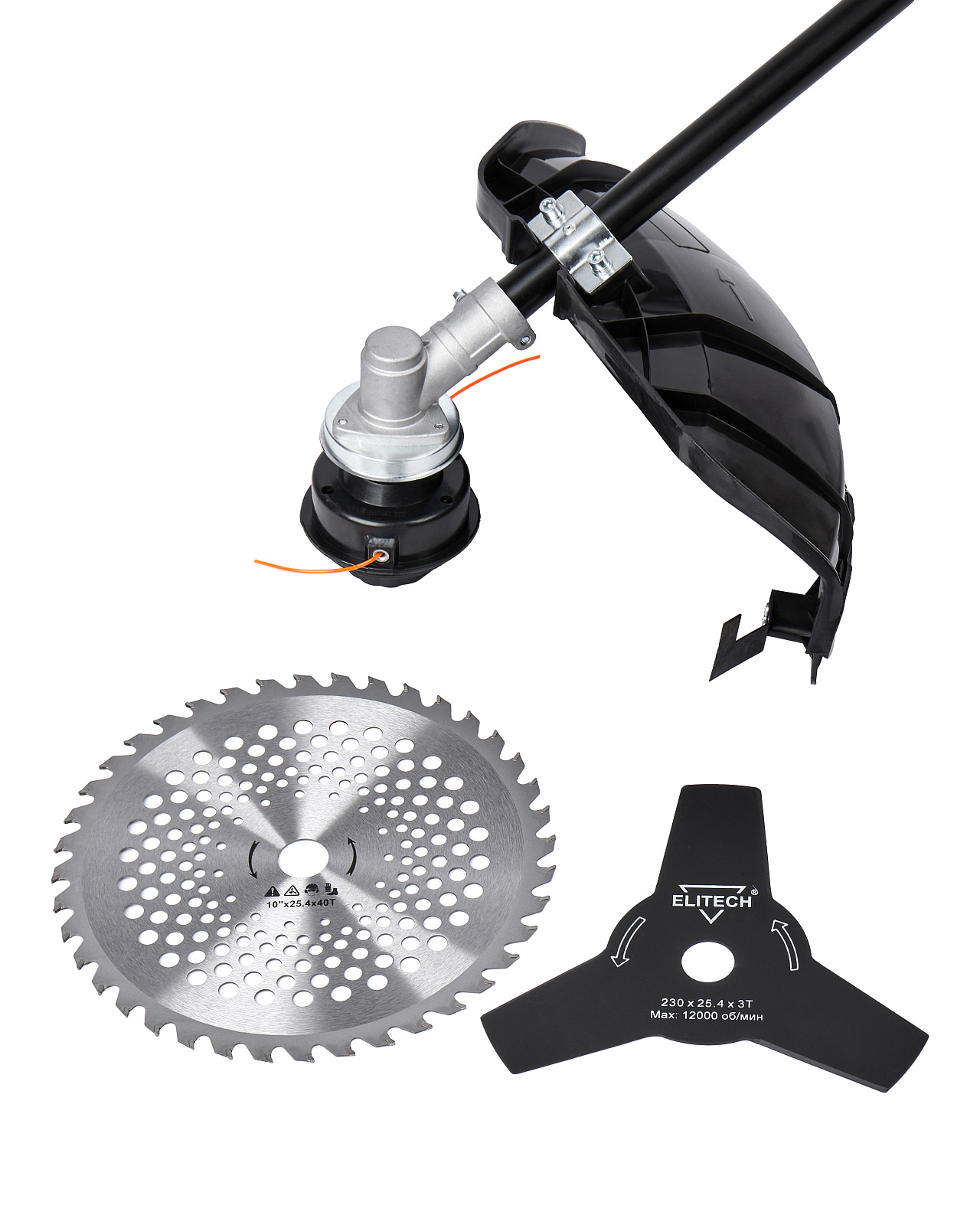Электрический триммер с прямой разборной штангой и велосипедной ручкой мощностью 1200 Вт, с шириной захвата кордом (леской) 400 мм, ножом 230 мм и диском 255 мм, предназначен для кошения вновь вырастающей и не переросшей травы на подготовленных участках с травяным покрытием, приусадебных и придомовых территориях.