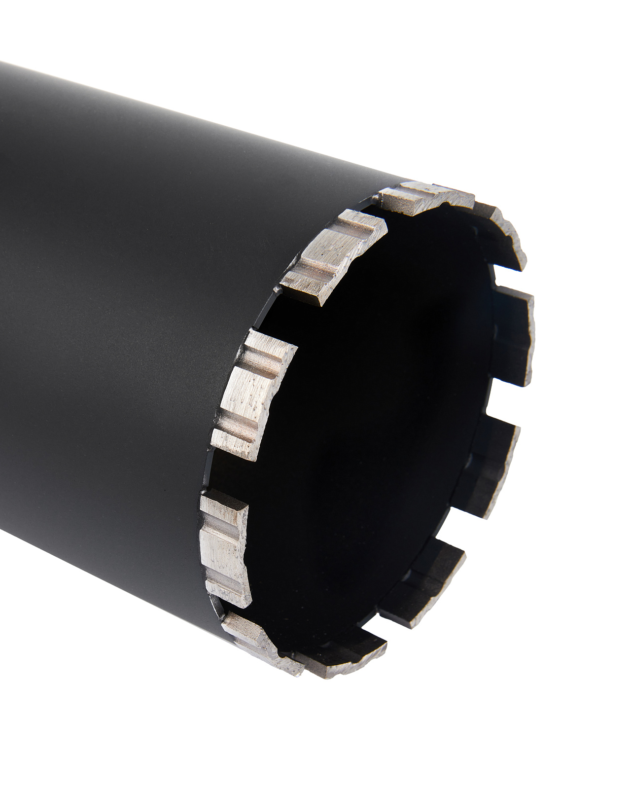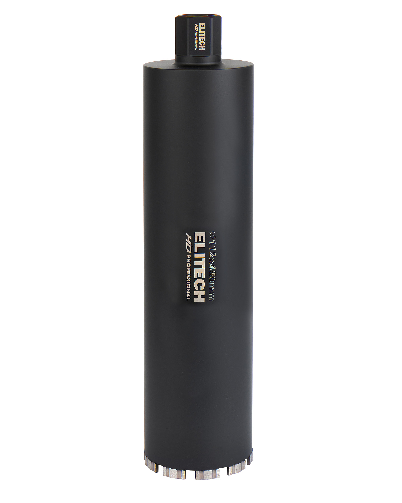 Алмазная коронка диаметром 112 мм и длиной 450 мм с резьбовым креплением 1 1/4'' применяется для сверления/бурения с охлаждением твердых материалов, таких как бетон, кирпич, гранит, мрамор, при использовании установок алмазного бурения.