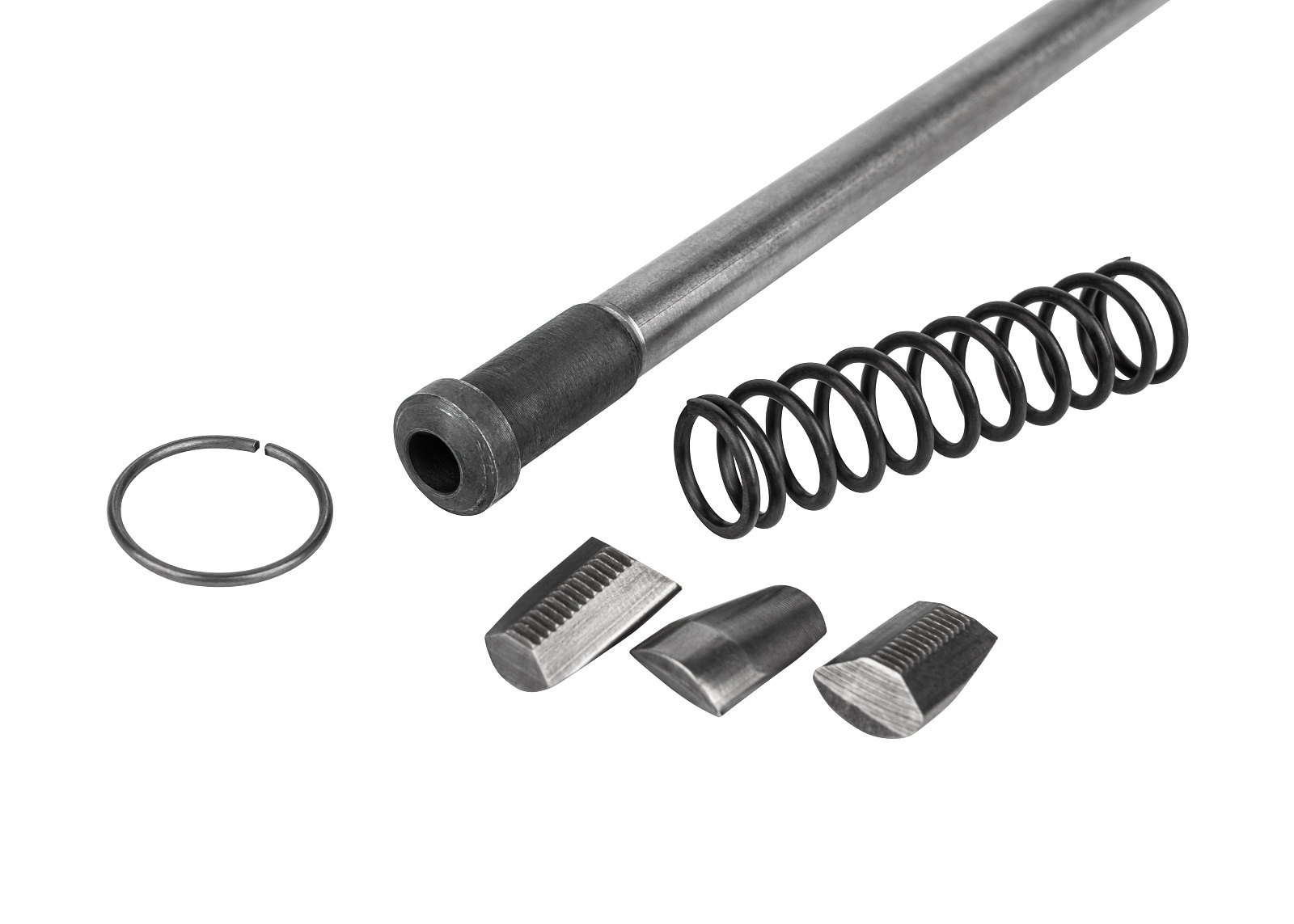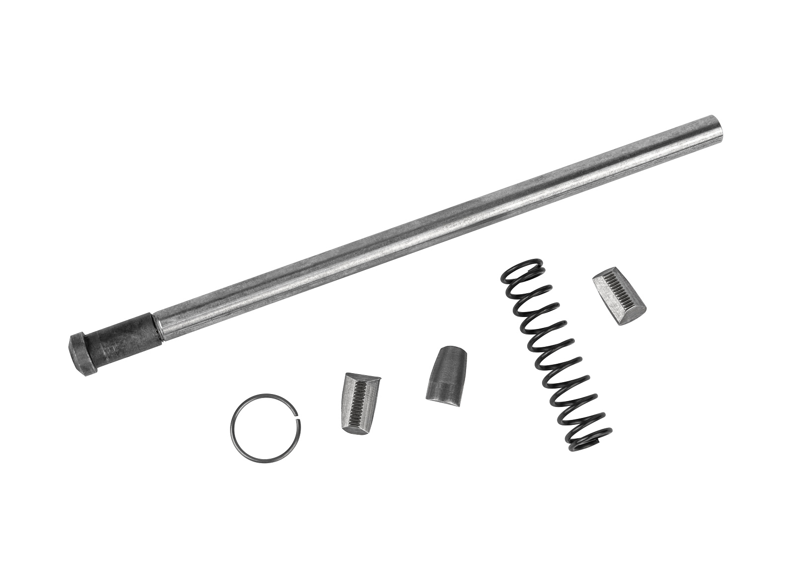 Ремкомплект представляет собой набор запасных частей для аккумуляторного заклепочного пистолета ПЗА 18БЛ, состоящий из металлического штока, трех губок, кольца и пружины.