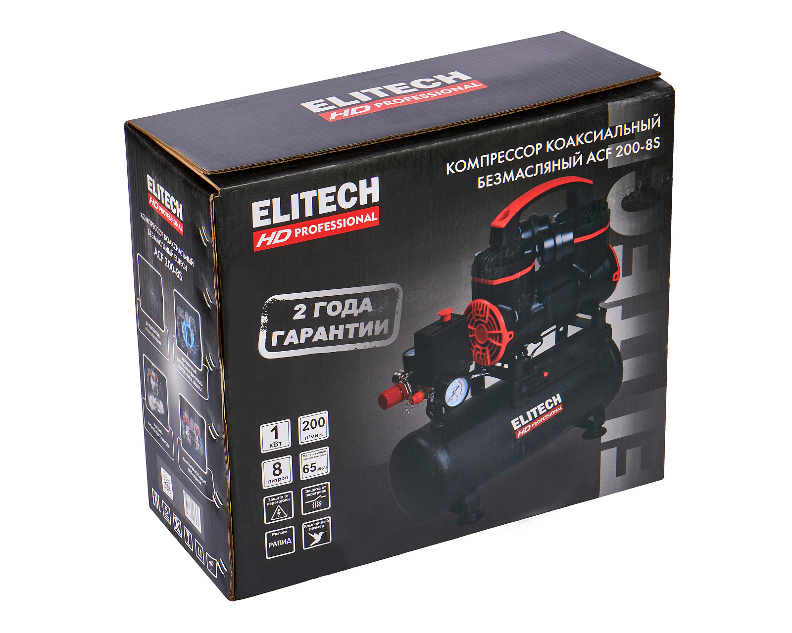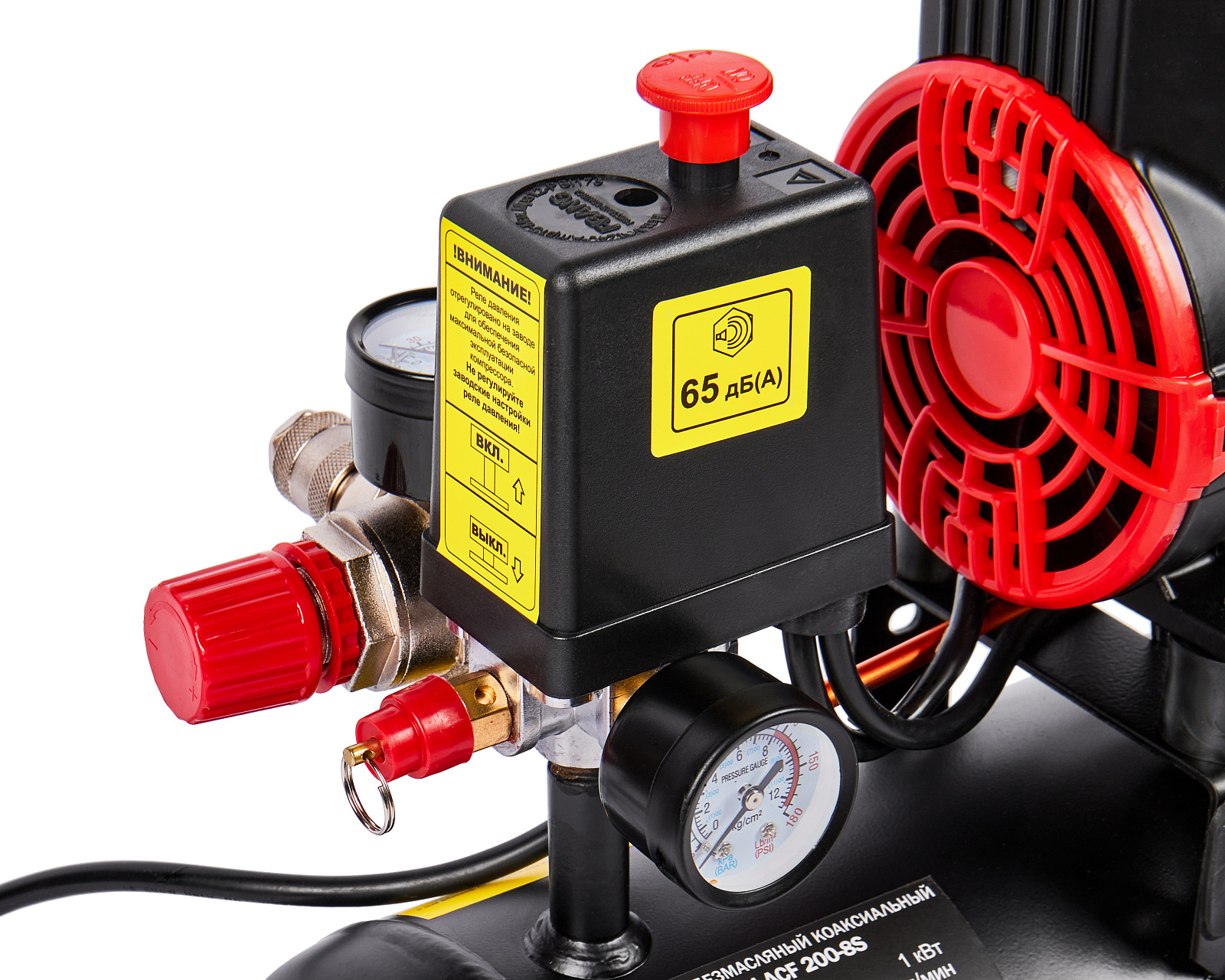 Воздушный безмасляный компрессор (объемного типа, с возвратно-поступательной конструкцией поршневого блока), мощностью 1 кВт и производительностью 200 л/мин с максимальным рабочим давлением 8 бар и ресивером на 8 литров, предназначен для подачи сжатого воздуха для работы с пневмоинструментом, краскопультами, мовильными и продувочными пистолетами, пистолетами для накачки шин и другим пневматическим оборудованием.