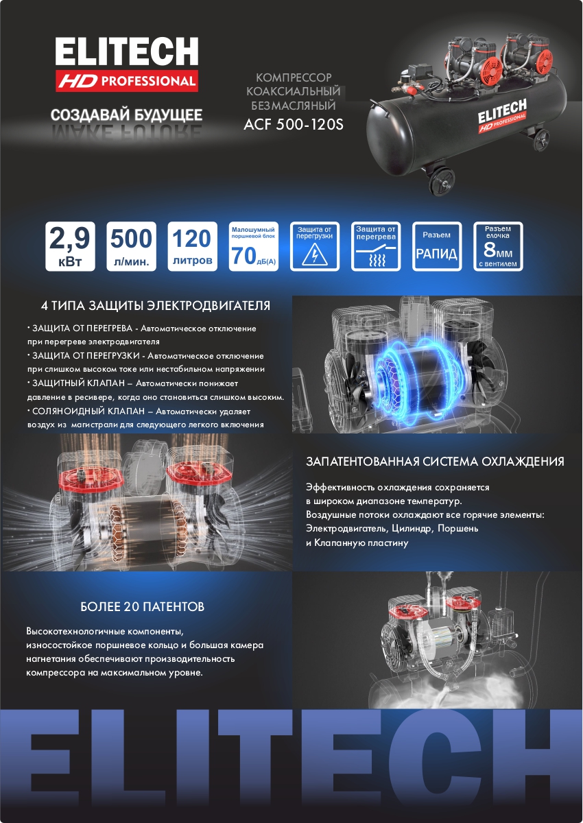 Воздушный безмасляный компрессор (объемного типа, с возвратно-поступательной конструкцией поршневого блока), мощностью 2,9 кВт и производительностью 500 л/мин с максимальным рабочим давлением 8 бар, предназначен для подачи сжатого воздуха для работы с пневмоинструментом, краскопультами, мовильными и продувочными пистолетами, пистолетами для накачки шин и другим пневматическим оборудованием.