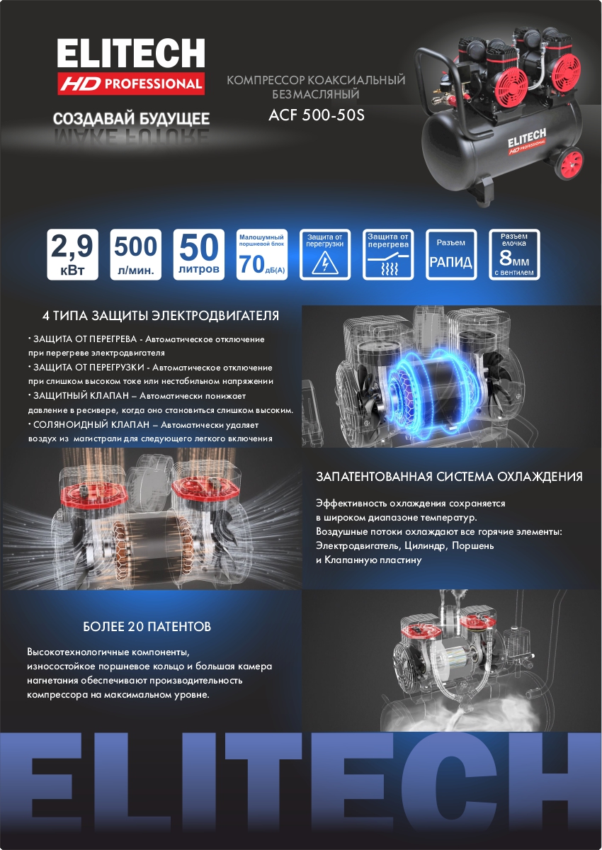 Воздушный безмасляный компрессор (объемного типа, с возвратно-поступательной конструкцией поршневого блока), мощностью 2,9 кВт и производительностью 500 л/мин с максимальным рабочим давлением 8 бар и ресивером на 50 литров, предназначен для подачи сжатого воздуха для работы с пневмоинструментом, краскопультами, мовильными и продувочными пистолетами, пистолетами для накачки шин и другим пневматическим оборудованием.