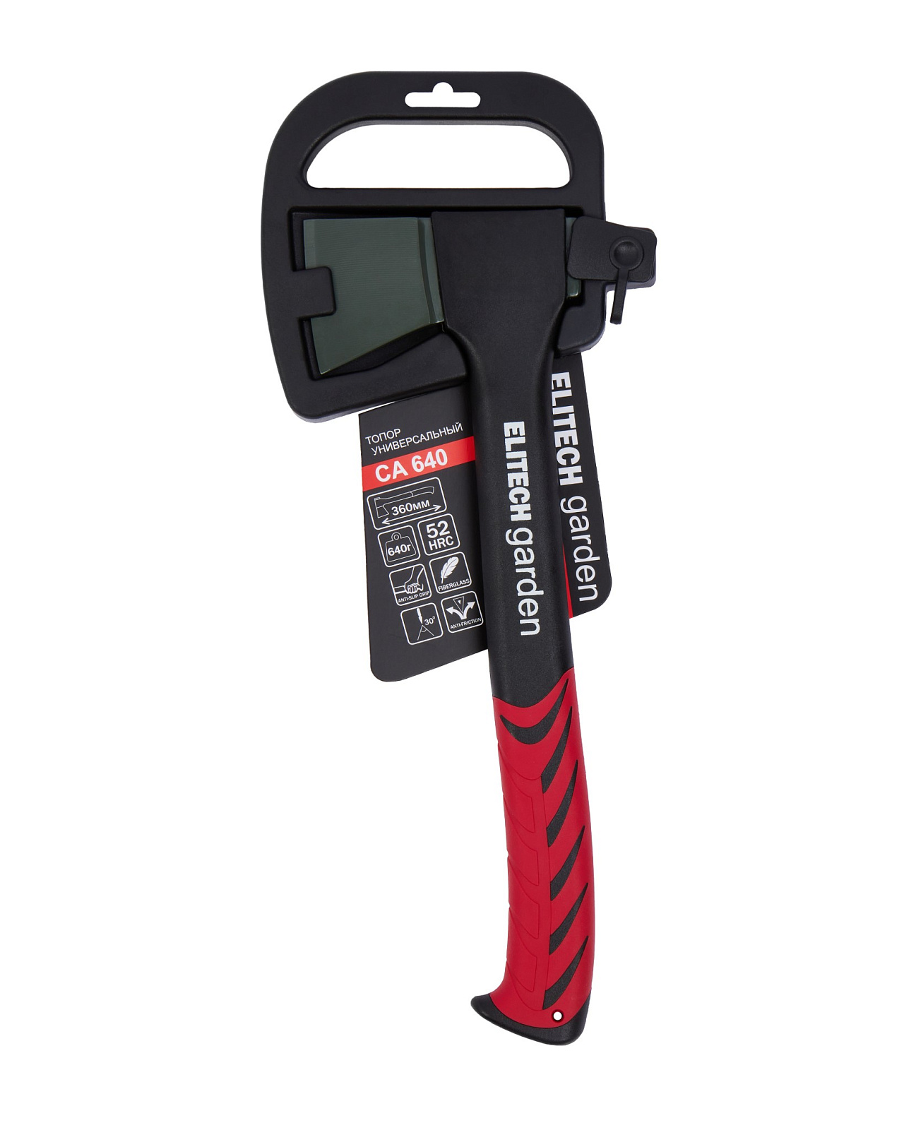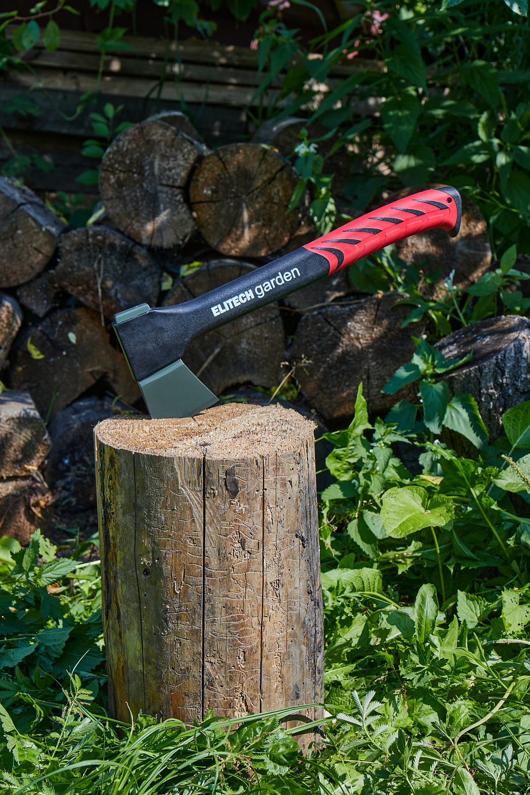 Универсальный топор длиной 360 мм и массой 640 г используется для рубки древесных материалов.