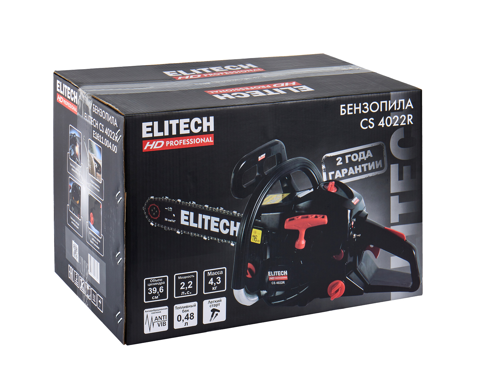 Как и подобает продукции премиального уровня, бензопилы ELITECH HD CS 4022R и CS 4125R поставляются в красочной упаковке, где помимо характеристик представлены основные преимущества моделей.