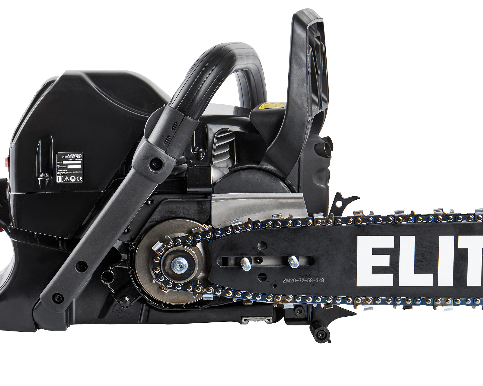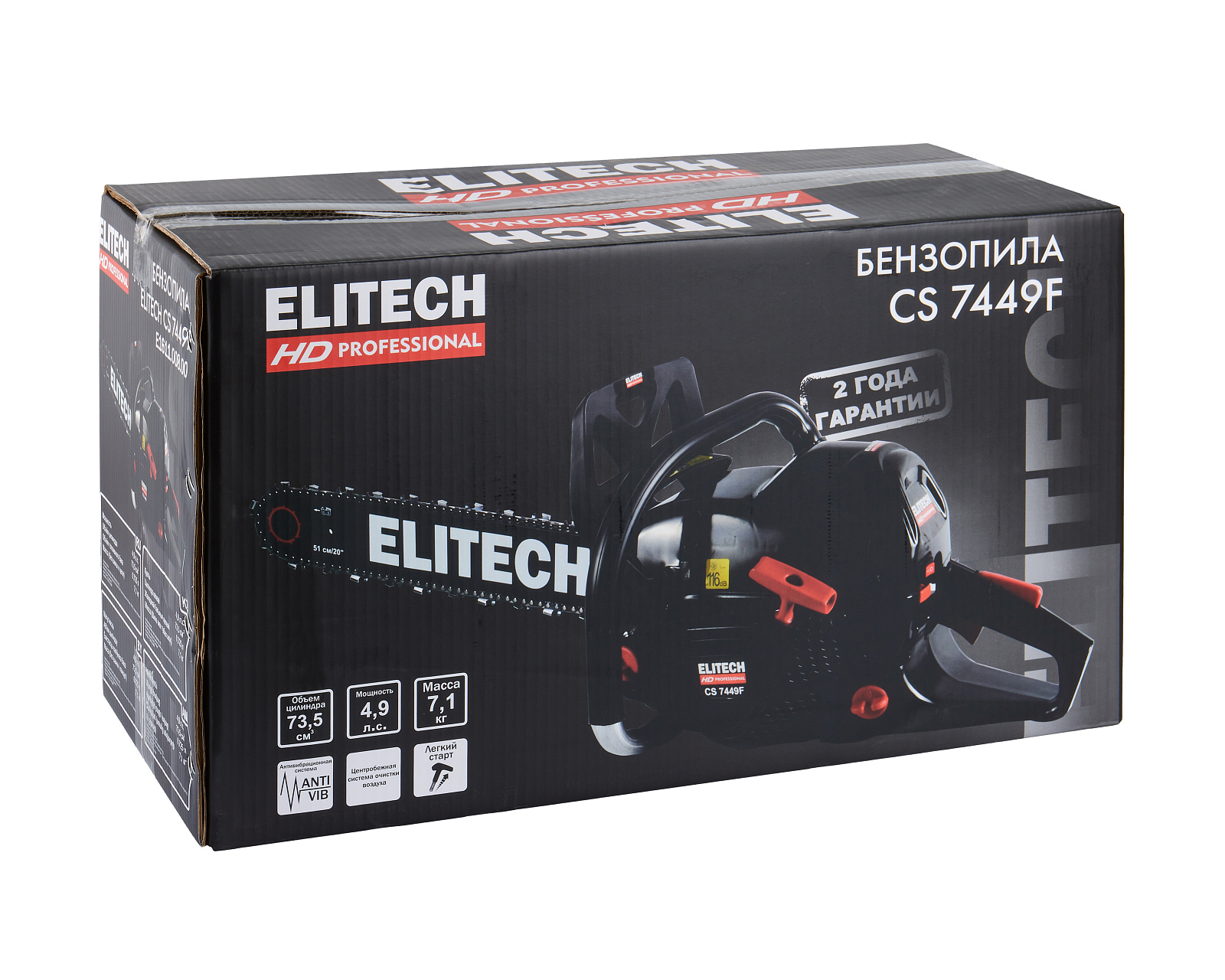 Как и подобает продукции премиального уровня, бензопила ELITECH CS 7449F поставляется в красочной упаковке, где помимо характеристик представлены основные преимущества модели.