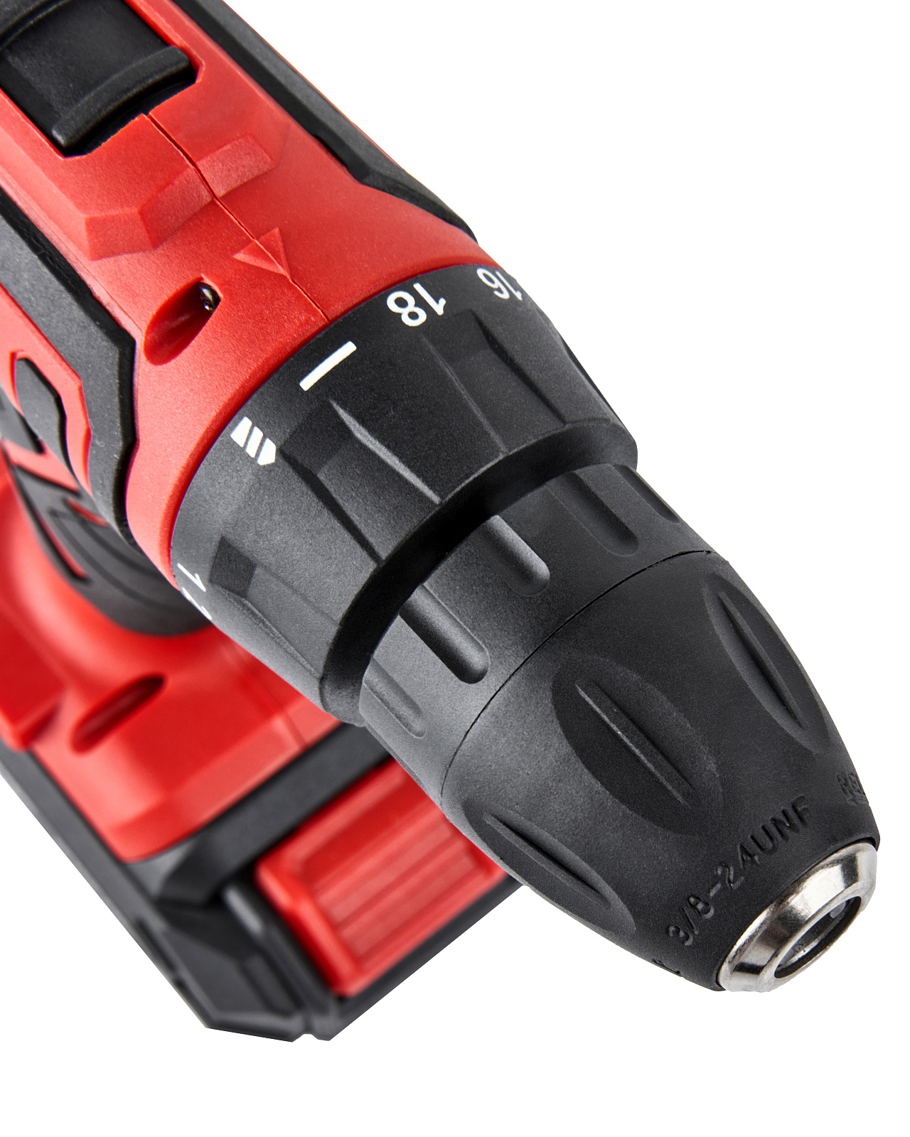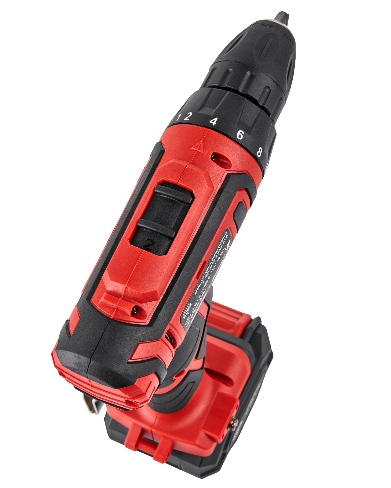 Дрель имеет две скорости (0-350 и 0-1350 об/мин), реверс, муфту ограничения крутящего момента с 18-ю положениями и возможностью отключения (для режима сверления). Патрон бесключевой, двухмуфтовый, с диапазоном зажима от 0,8 до 10 мм. Эргономичная рукоятка имеет накладки для предотвращения проскальзывания в руке. Имеется светодиодная подсветка, скоба подвеса на ремень, индикатор уровня заряда аккумулятора (на корпусе дрели), встроенные магниты (2 шт.) для хранения запасных (сменных) бит. Шестерни в редукторе выполнены из стали.