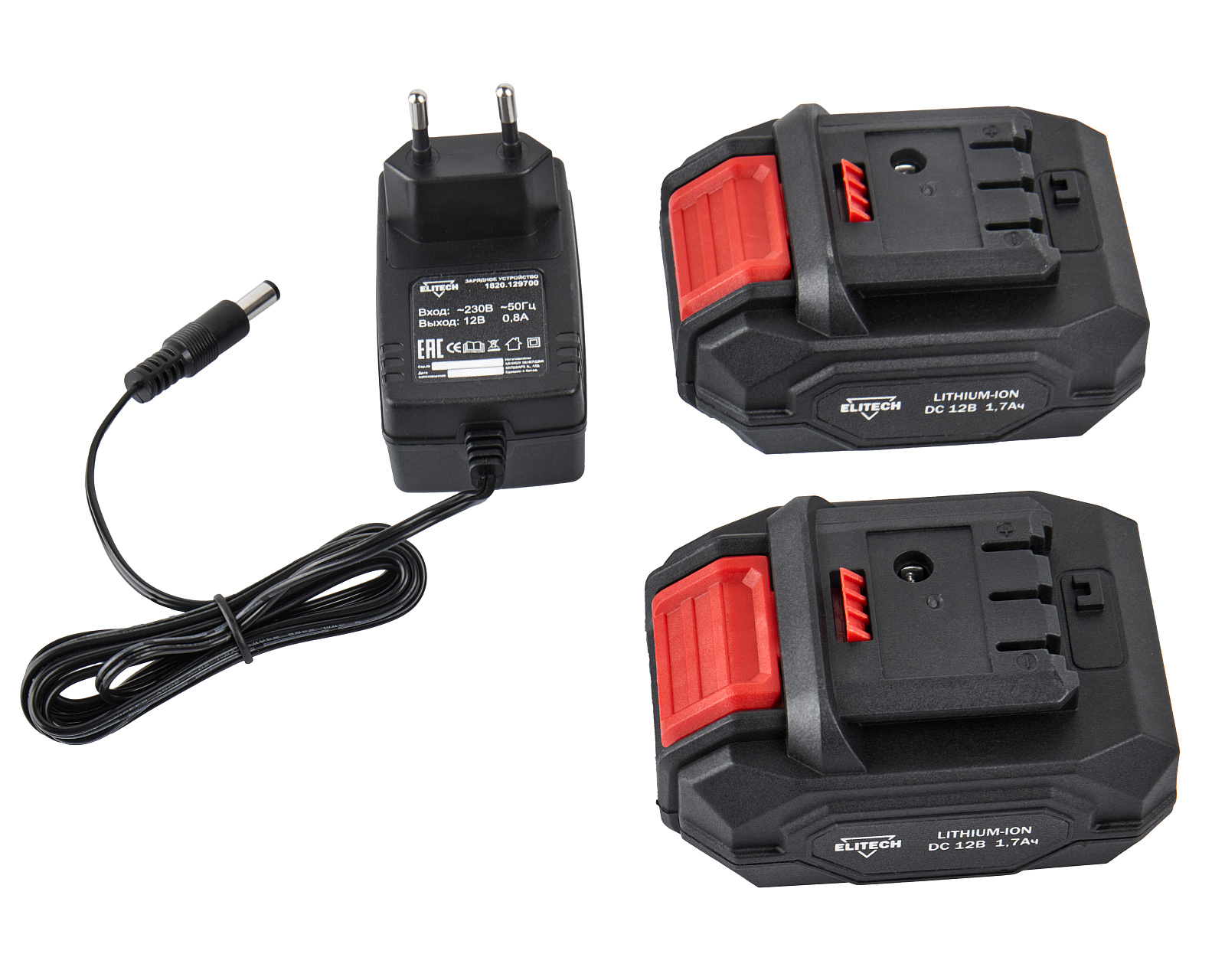 Для питания дрели используется Li-Ion аккумулятор, напряжением 12 вольт и емкостью 1,7 Ач (в комплекте 2 шт.). Время заряда аккумулятора штатным зарядным устройством составляет 60 минут.