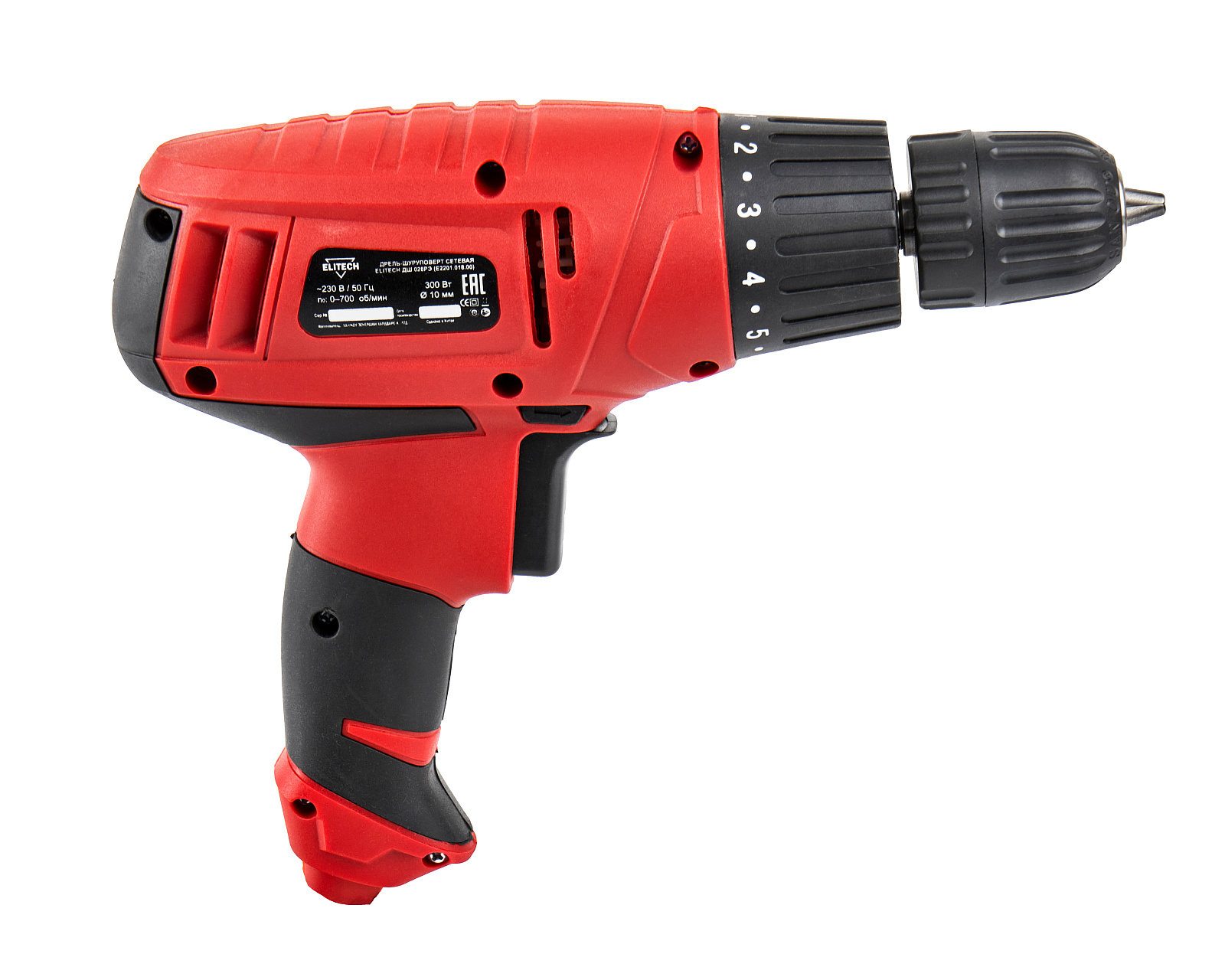 Мощность 300 Вт, диапазон зажима патрона 0,8-10 мм, максимальный крутящий момент 25 Нм, максимальный диаметр сверления 20 мм в дереве, 10 мм в стали, длина кабеля питания 2 метра, масса 1,3 кг.