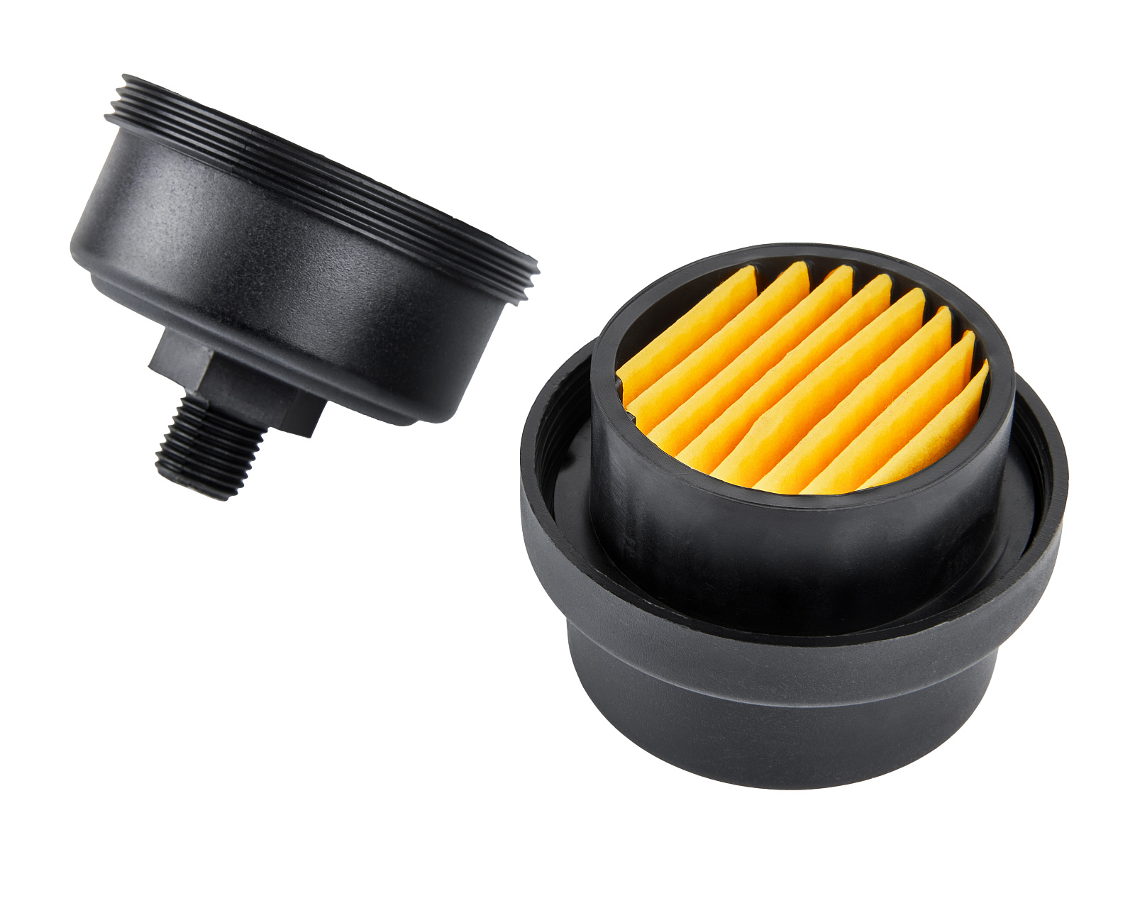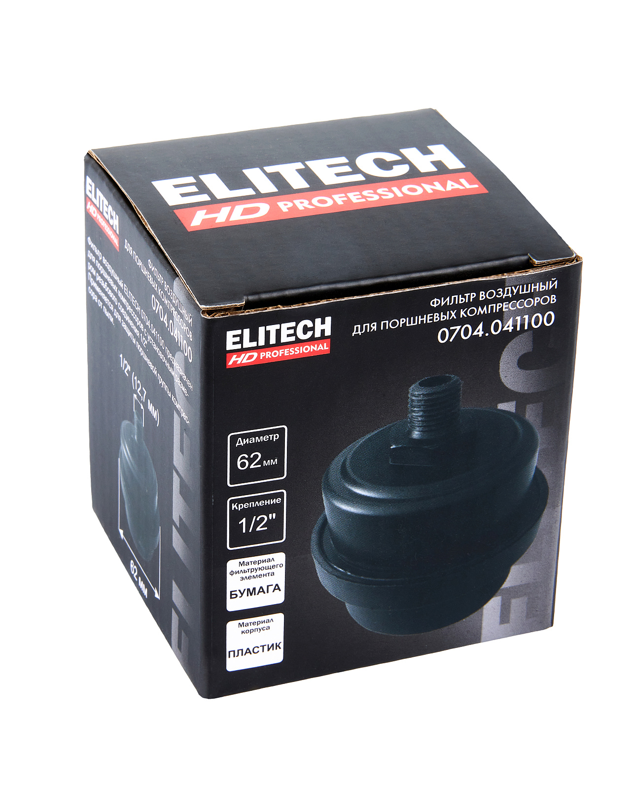 Фильтр воздушный ELITECH HD с бумажным фильтрующим элементом в пластиковом корпусе, предназначен для однофазных поршневых компрессоров с ресивером объемом 8 л, 24 л, 50 л, 120 л, с установочным резьбовым соединением 1/2' и служит для очистки от пыли и грязи поступающего в блок компрессора воздуха.