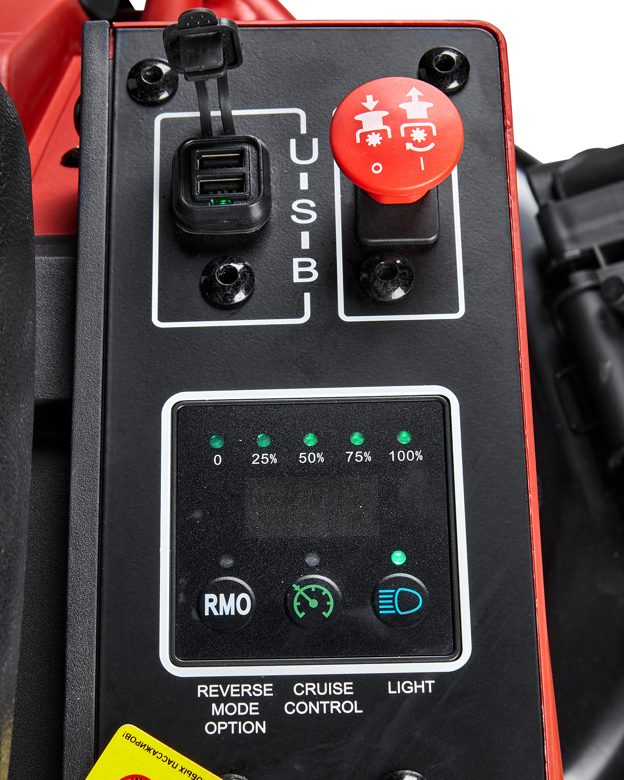 Индикатор статуса зарядки аккумулятора, круиз-контроль, электрический механизм включения вращения ножей, два USB порта