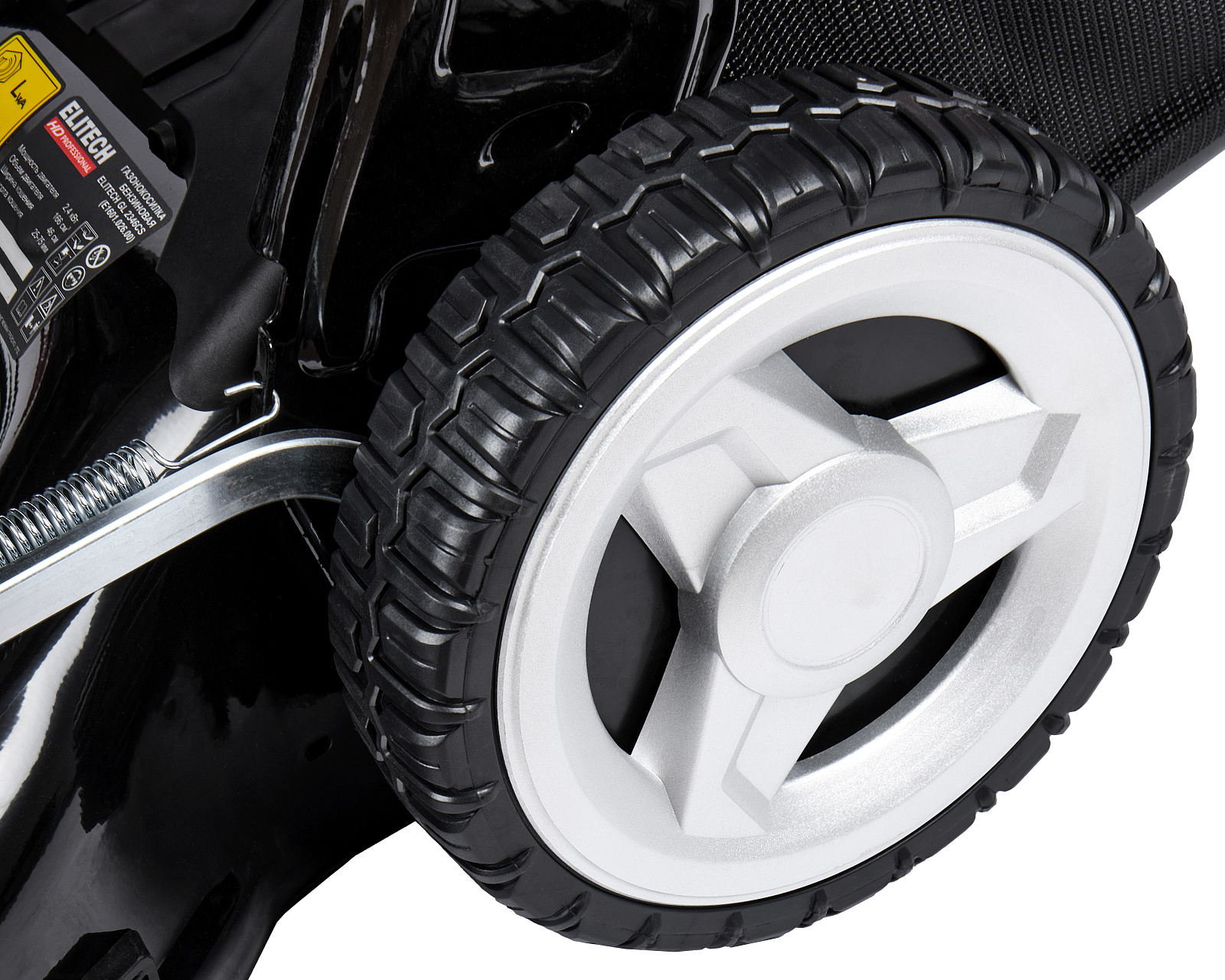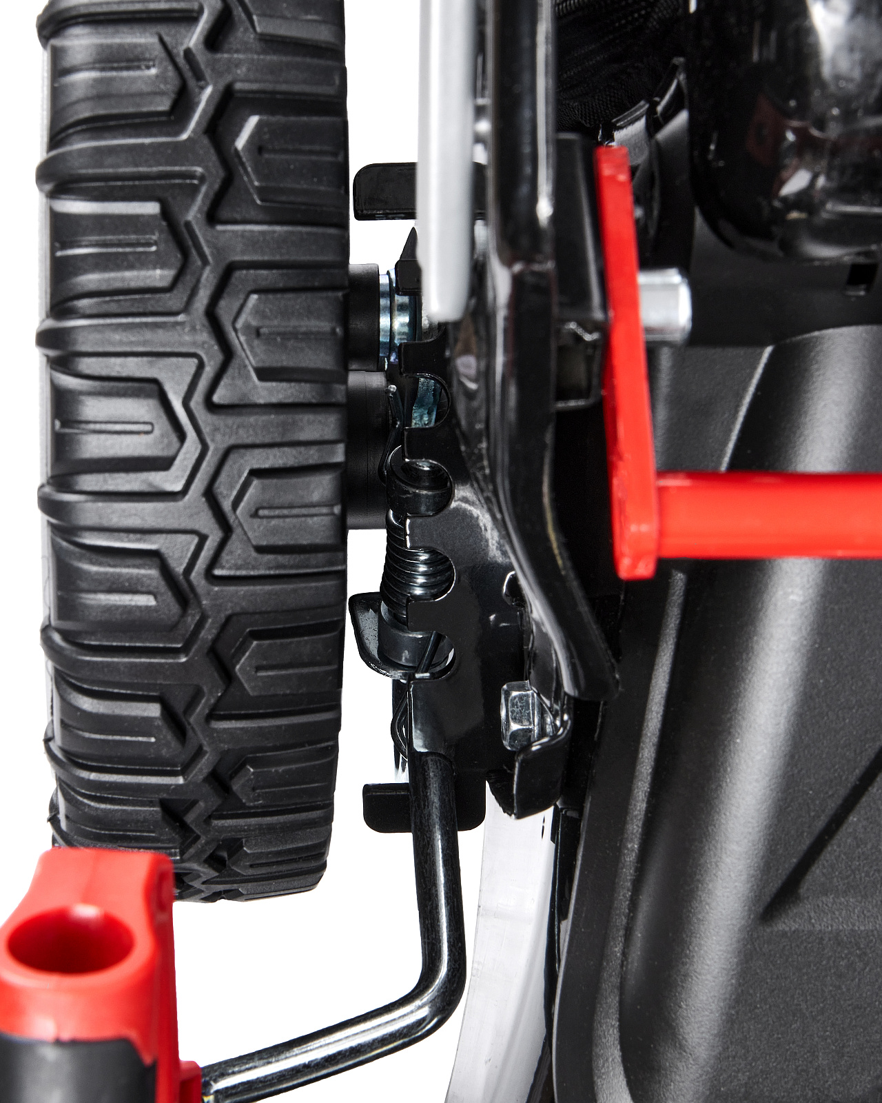 Колеса газонокосилок имеют большой диаметр, что упрощает их маневрирование при эксплуатации. Обода колёс сделаны из резины, а сами колёса установлены на двойные шарикоподшипники, что увеличивает ресурс эксплуатации компонентов. Модели имеют эргономичный дизайн, оснащены приводом на колеса, центральной регулировкой высоты кошения, объёмным травосборником, дефлектором выброса скошенной травы вбок и заглушкой для мульчирования, чтобы расширить функциональность техники, в зависимости требований при обработке участка с газоном.