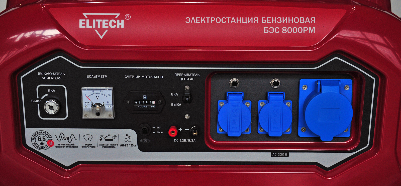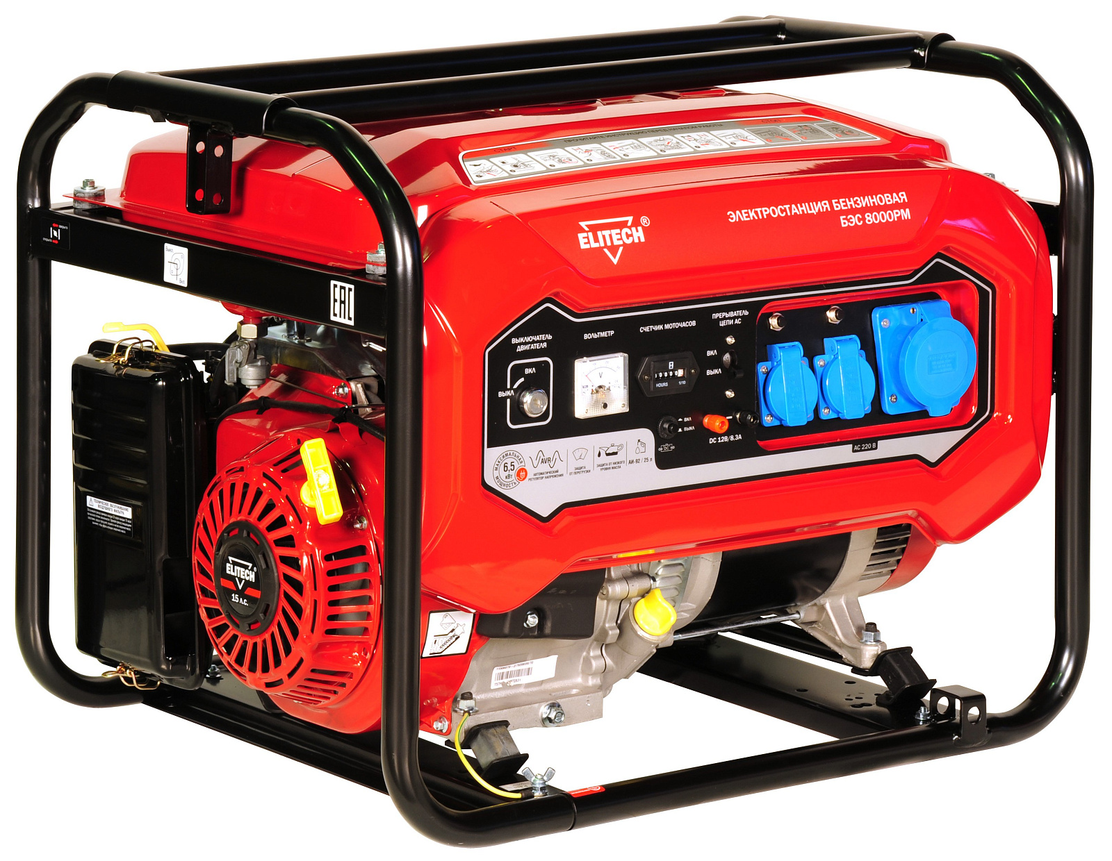Электростанция БЭС 8000 РМ с четырехтактным бензиновым двигателем. Однофазная. Номинальная мощность 6,0кВт. Две розетки 220В/16А. Одна розетка 220В/32А. Ручной стартер.