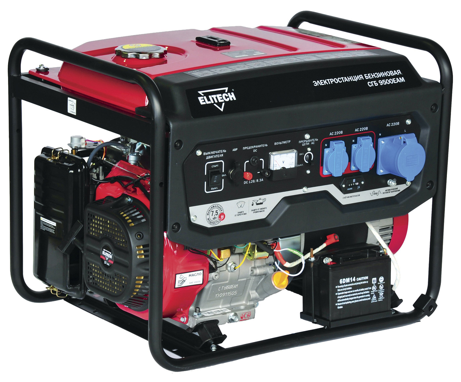 Электростанция СГБ 9500 ЕАМ с четырехтактным бензиновым двигателем. Однофазная. Номинальная мощность 7 кВт. Две розетки 220В/16А. Одна розетка 220В/32А. Электростартер. Работа с блоком ввода резерва АВР 10.