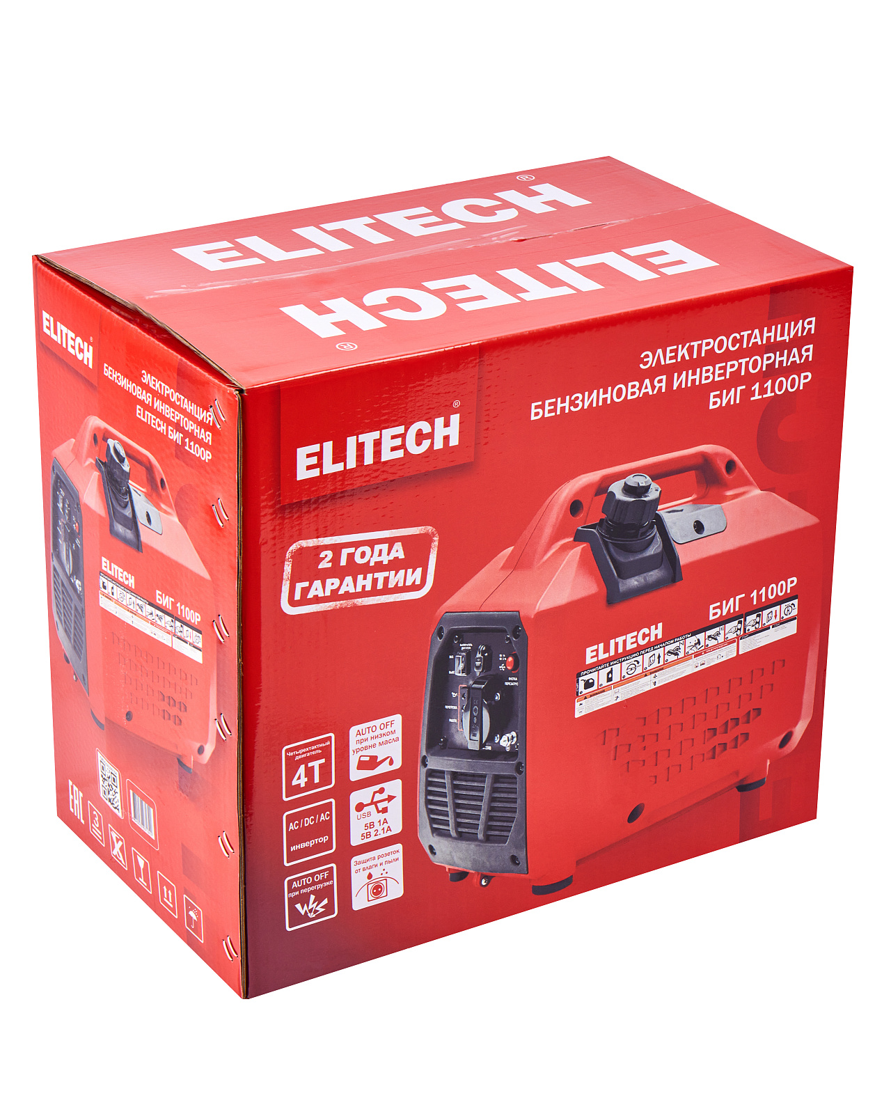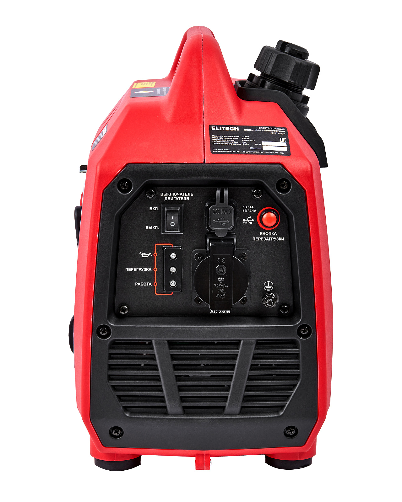 Инверторный генератор (электростанция) мощностью 1 кВт (макс. 1,1 кВт) с 4-х тактным бензиновым двигателем, предназначен для работы в качестве автономного источника электроэнергии переменного однофазного тока напряжением 230В, частотой 50Гц. Генератор снабжен одной розеткой на 16 А и двумя выходами USB: 5В/1А, 5В/2,1А.