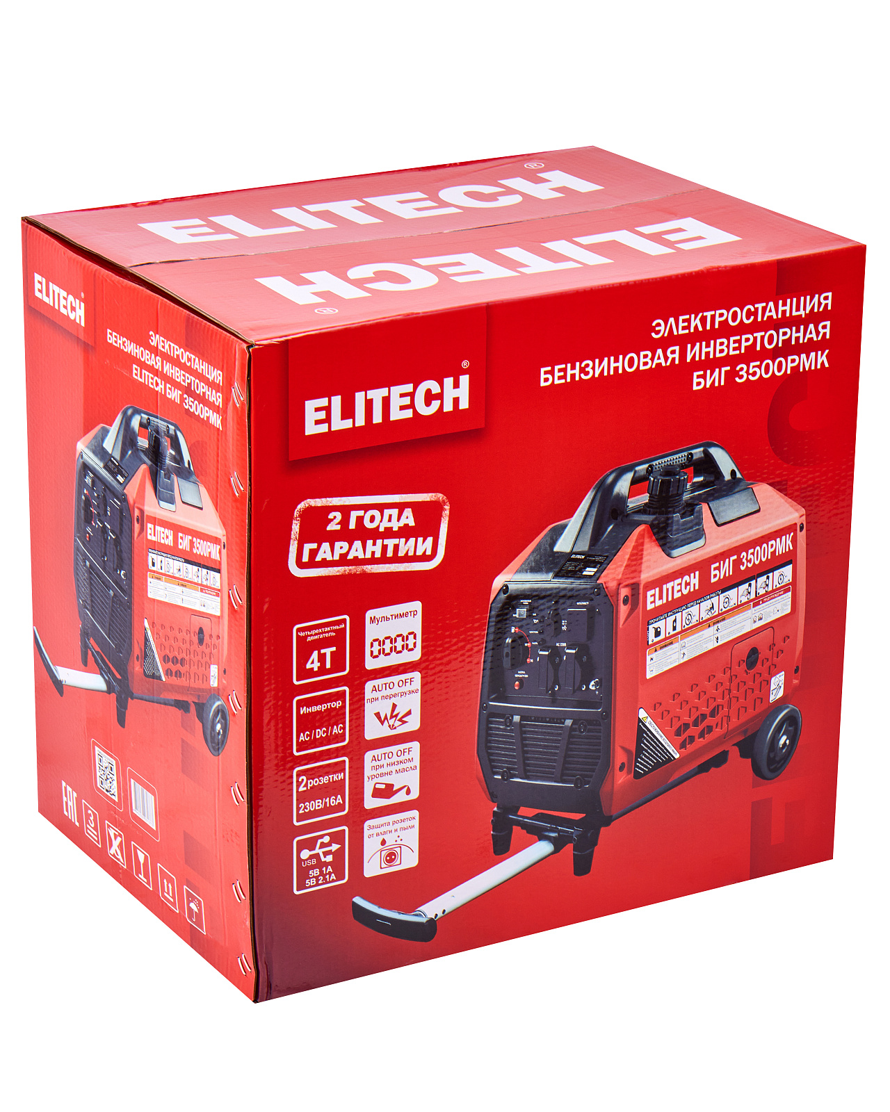 Инверторный генератор (электростанция) мощностью 3,2 кВт (макс. 3,5 кВт) с 4-х тактным бензиновым двигателем, предназначен для работы в качестве автономного источника электроэнергии переменного однофазного тока напряжением 230В, частотой 50Гц. Генератор снабжен двумя розетками на 16 А, двумя выходами USB: 5В/1А, 5В/2,1А; мультиметром, а также тележкой для перевозки с выдвижной ручкой.