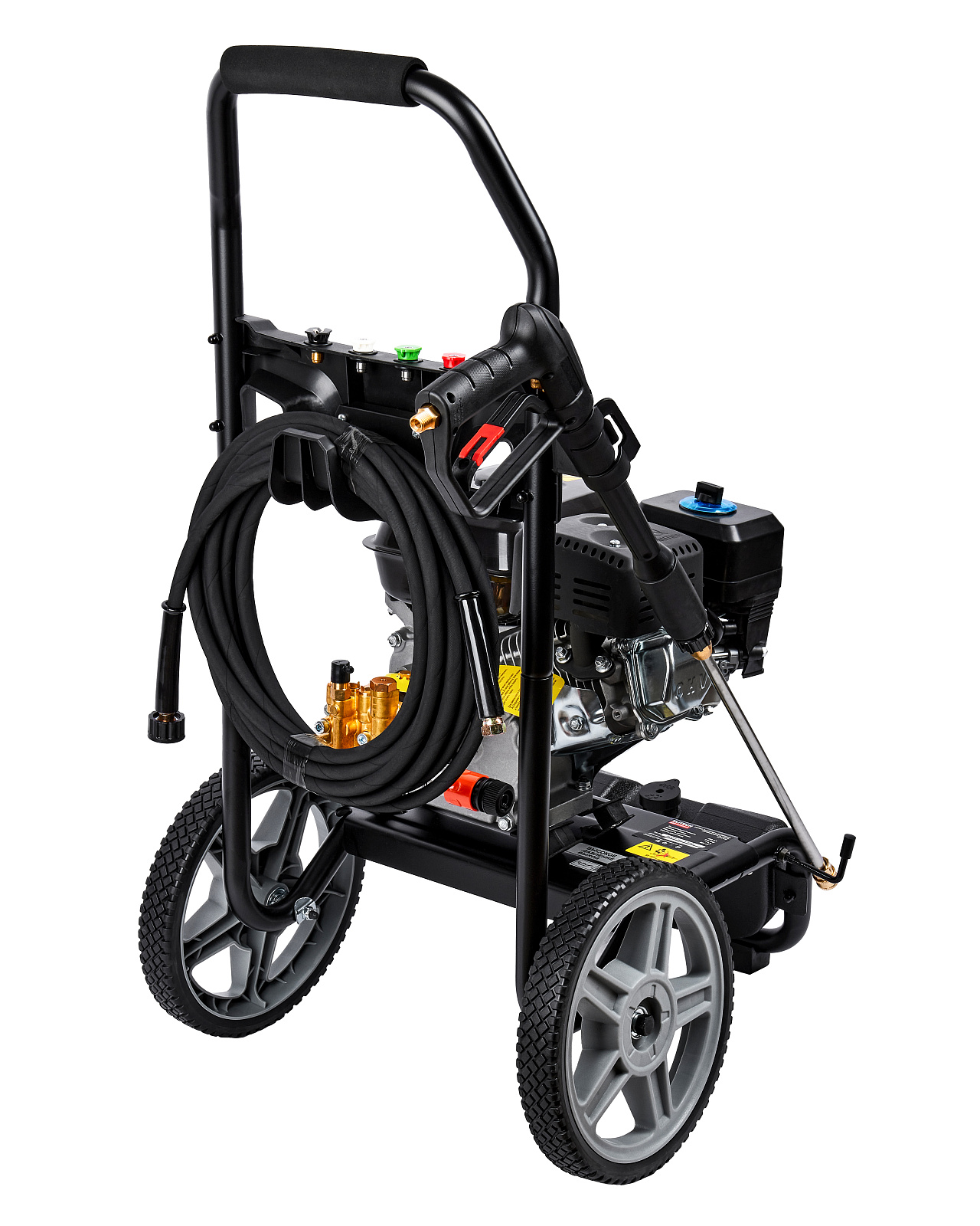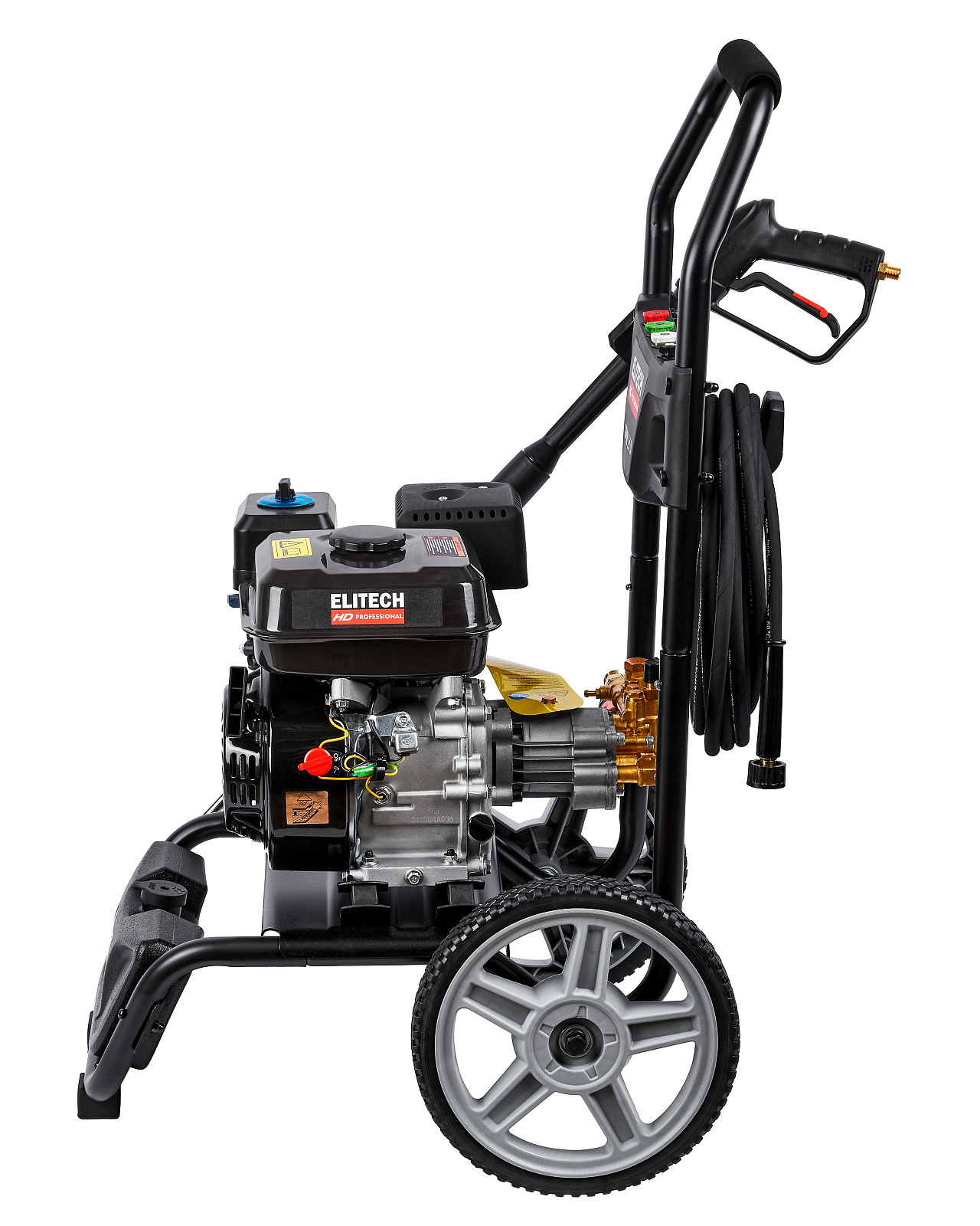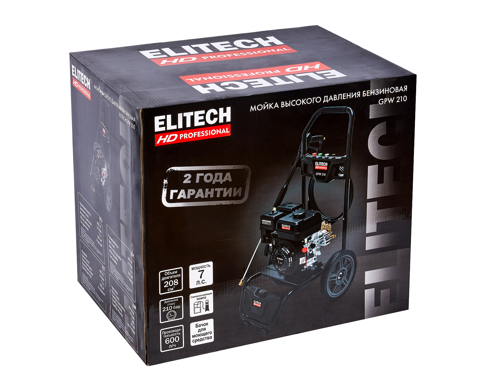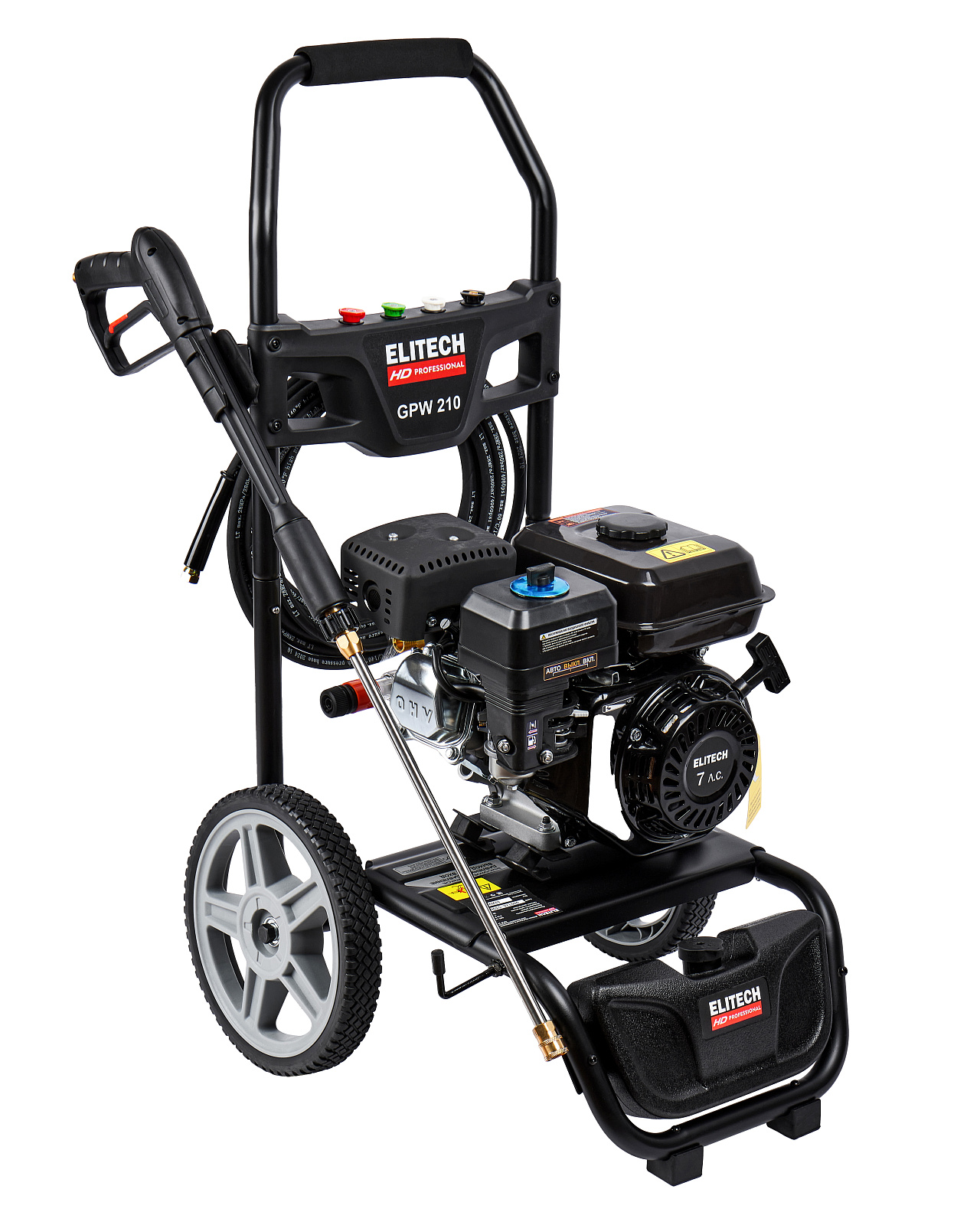 Мойка высокого давления с бензиновым двигателем мощностью 7 л.с., с четырьмя распылительными насадками, предназначена для мойки автомобилей и любой другой техники, а также террас, тротуарной и фасадной плитки, фасадов зданий и для прочистки дождевых сливов. Мойка должна работать только с чистой водой без механических примесей. Для бесконтактной мойки с применением пеногенератора используется специальное средство, предназначенное для этих целей. Мойка Elitech является самовсасывающей и может забирать воду, как из водопровода, так и из емкости с водой.