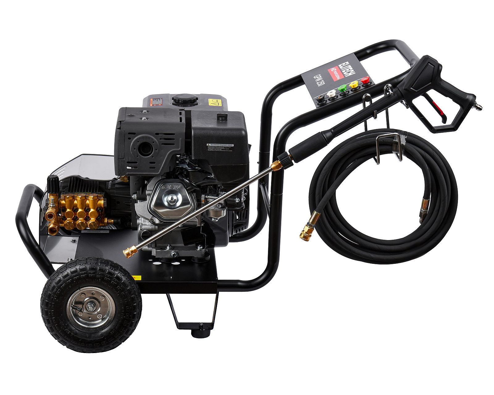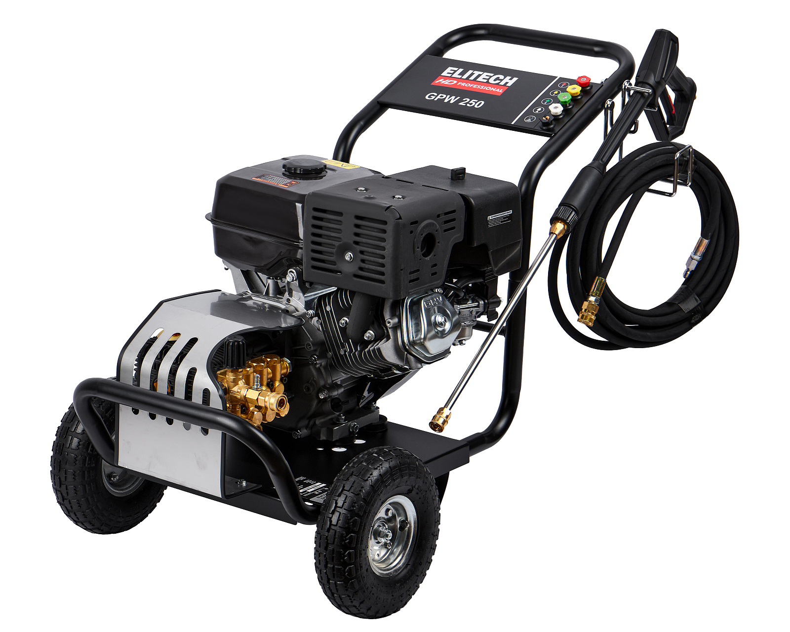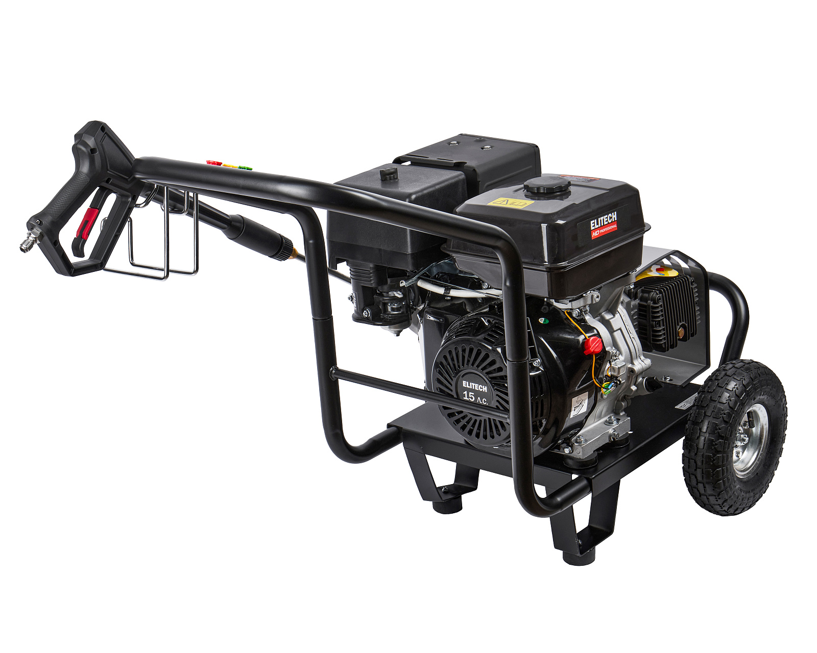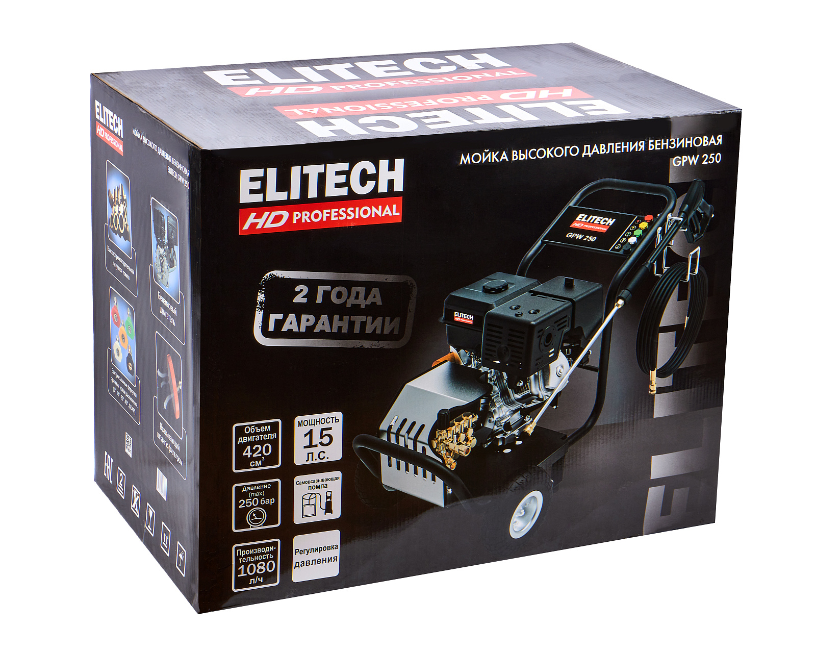 Мойка высокого давления с бензиновым двигателем мощностью 15 л.с., с пятью распылительными насадками, предназначена для мойки автомобилей и любой другой техники, а также террас, тротуарной и фасадной плитки, фасадов зданий и для прочистки дождевых сливов. Мойка должна работать только с чистой водой без механических примесей. Для бесконтактной мойки с применением пеногенератора используется специальное средство, предназначенное для этих целей. Мойка Elitech является самовсасывающей и может забирать воду, как из водопровода, так и из емкости с водой.