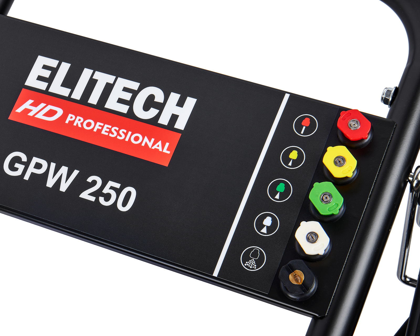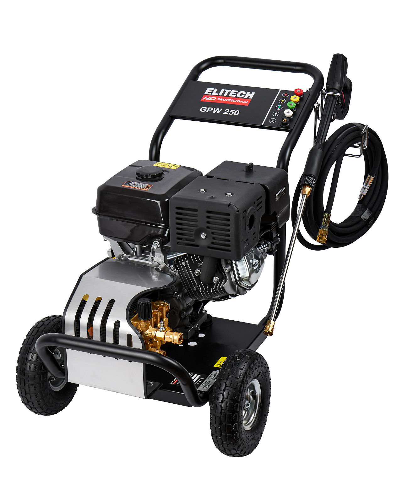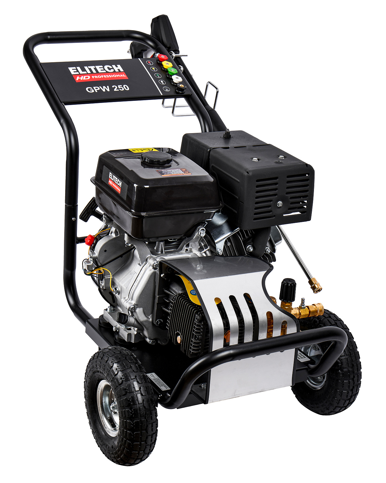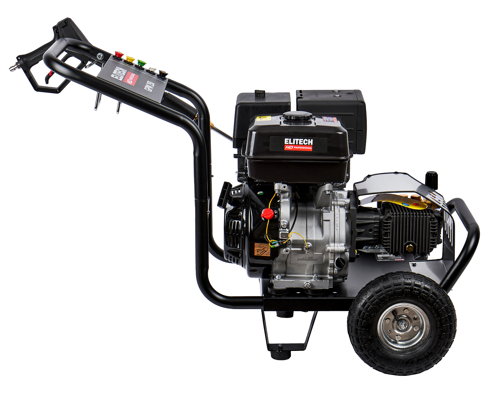 Мойка высокого давления с бензиновым двигателем мощностью 15 л.с., с пятью распылительными насадками, предназначена для мойки автомобилей и любой другой техники, а также террас, тротуарной и фасадной плитки, фасадов зданий и для прочистки дождевых сливов. Мойка должна работать только с чистой водой без механических примесей. Для бесконтактной мойки с применением пеногенератора используется специальное средство, предназначенное для этих целей. Мойка Elitech является самовсасывающей и может забирать воду, как из водопровода, так и из емкости с водой.
