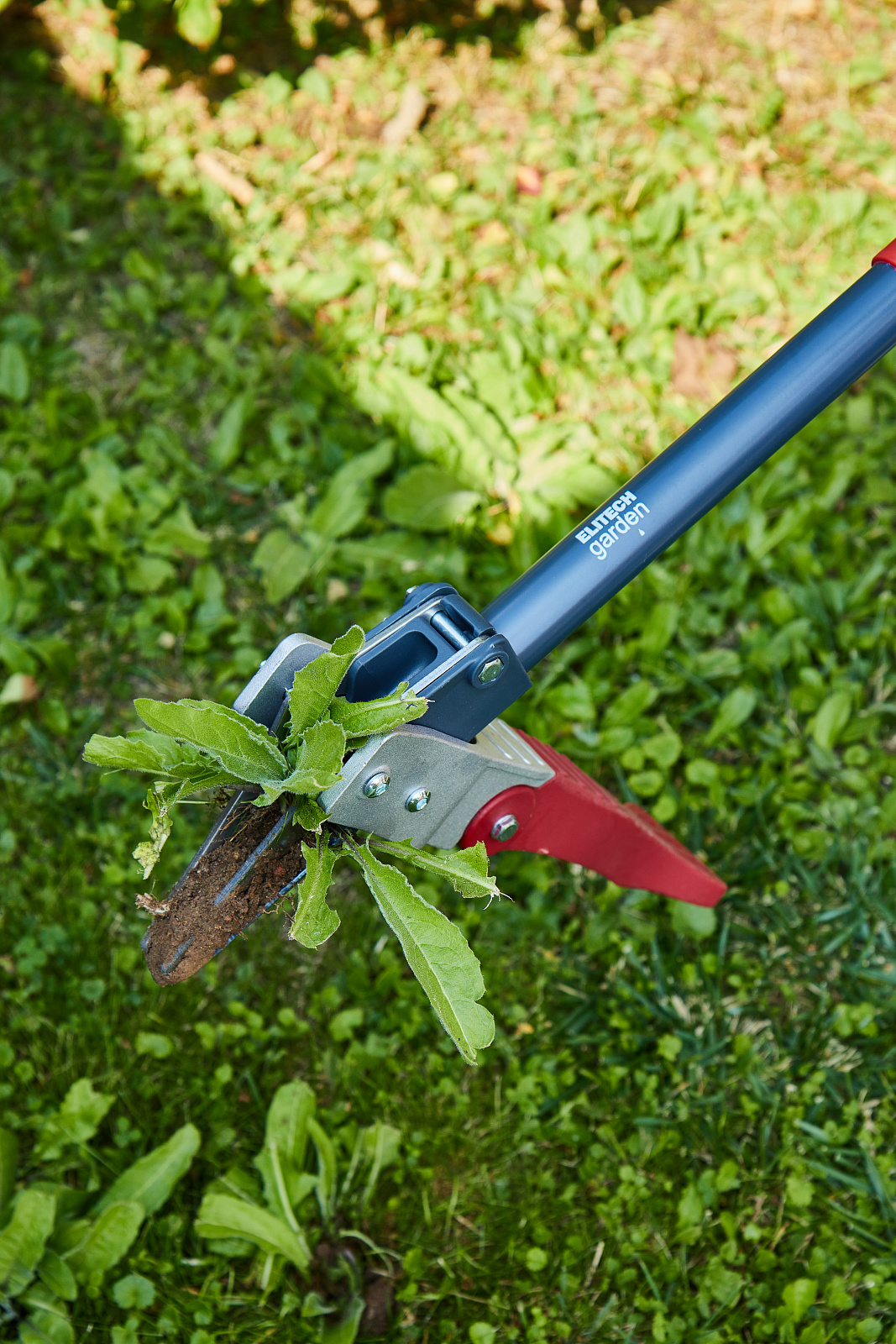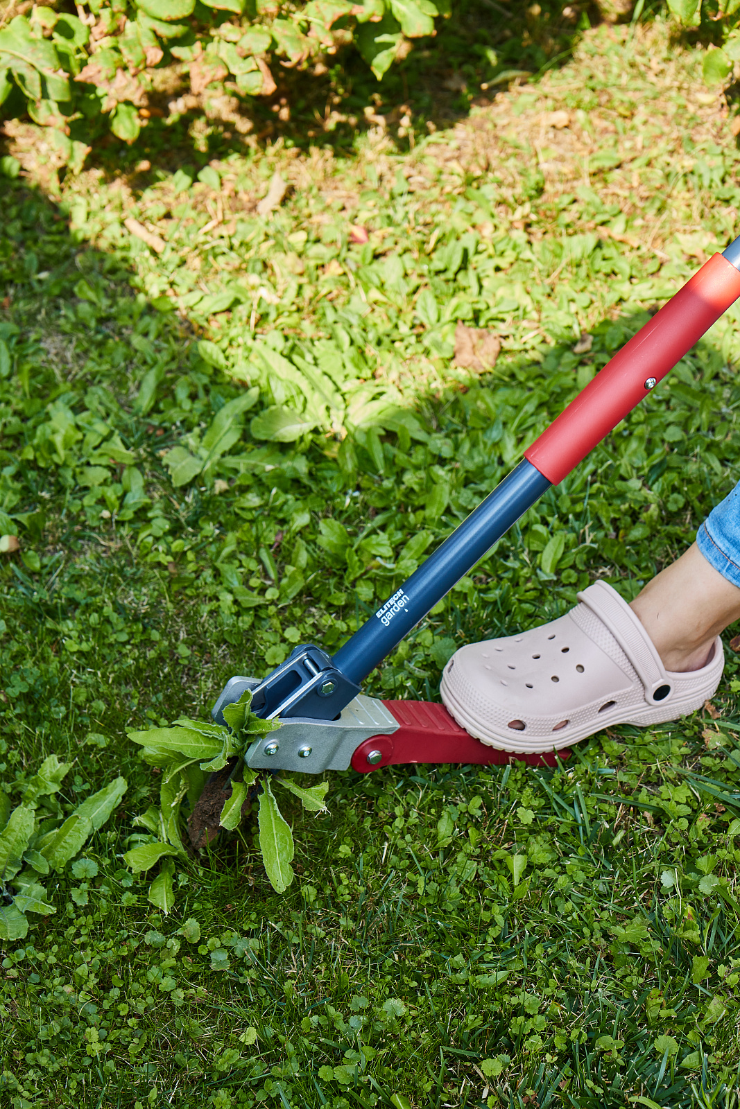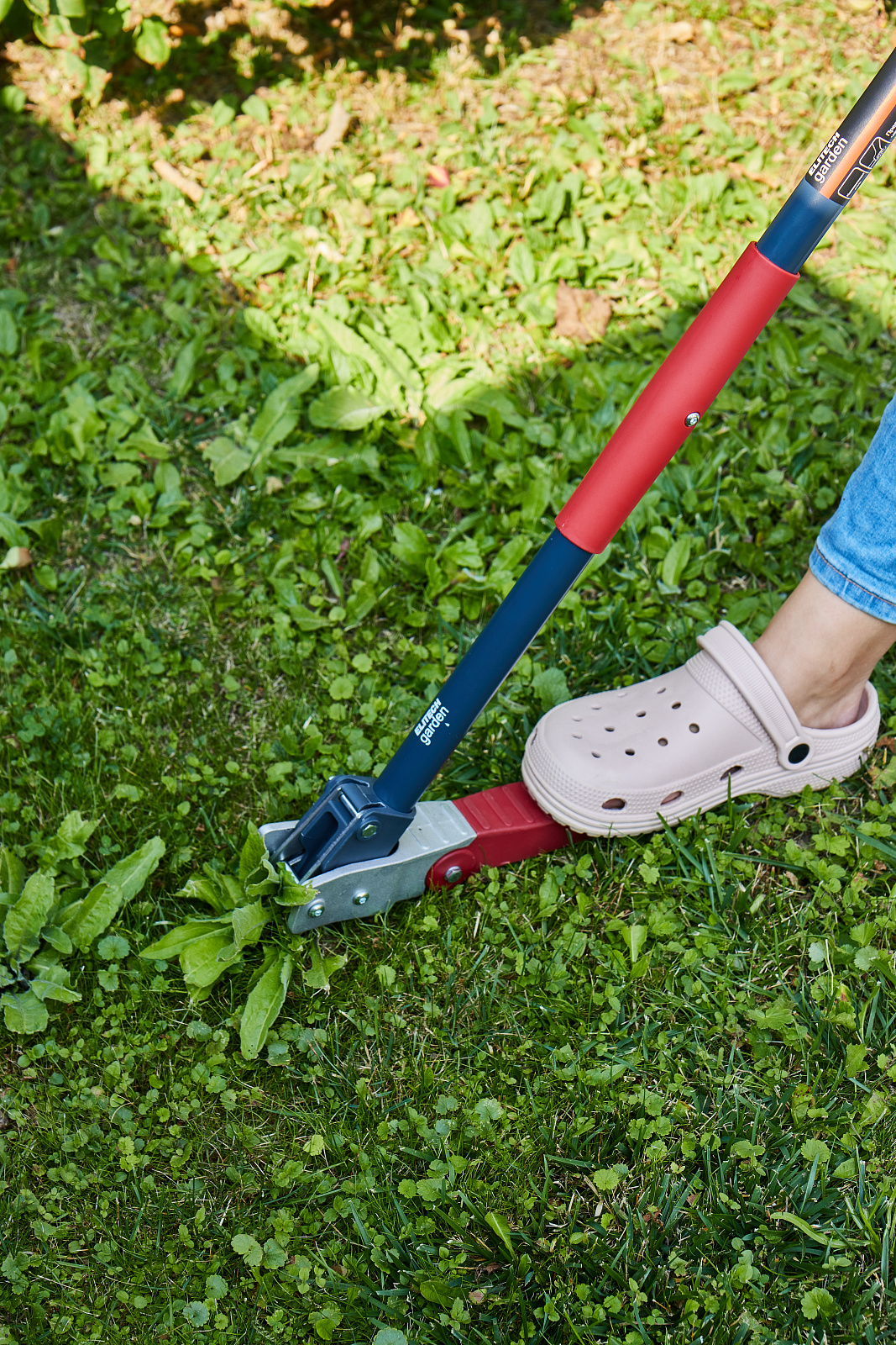 Удалитель сорняков с зажимным механизмом и ножным упором, позволяет точечно выкапывать из земли корень сорняка.