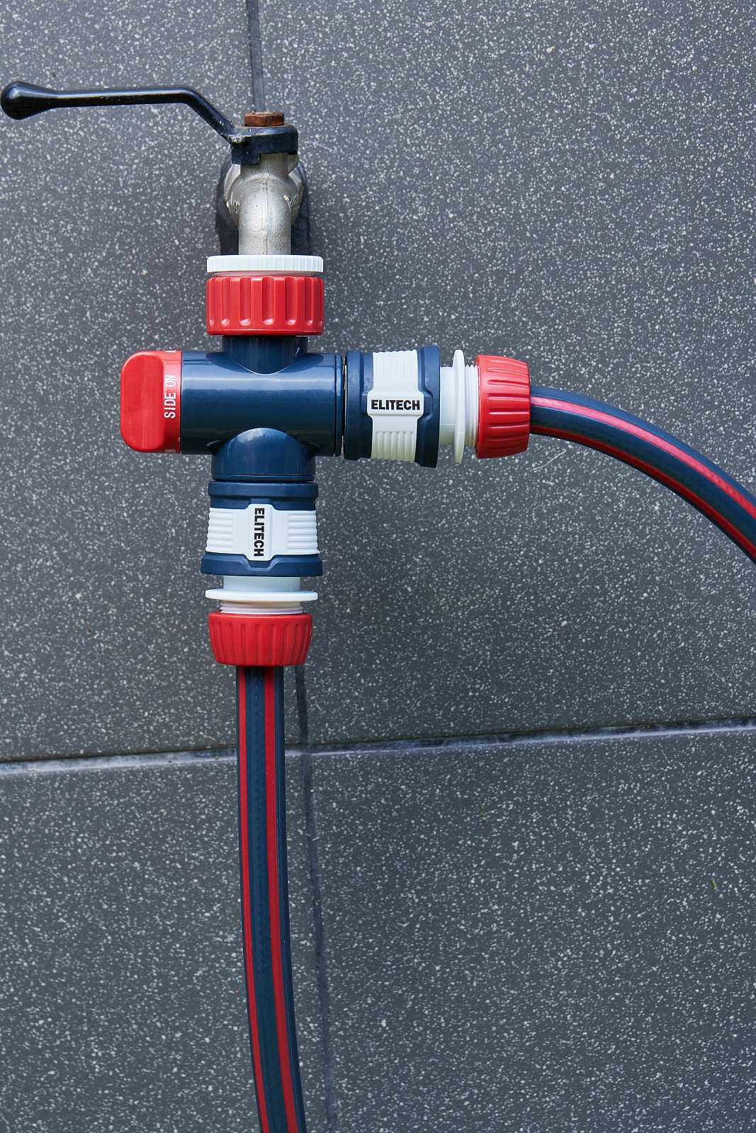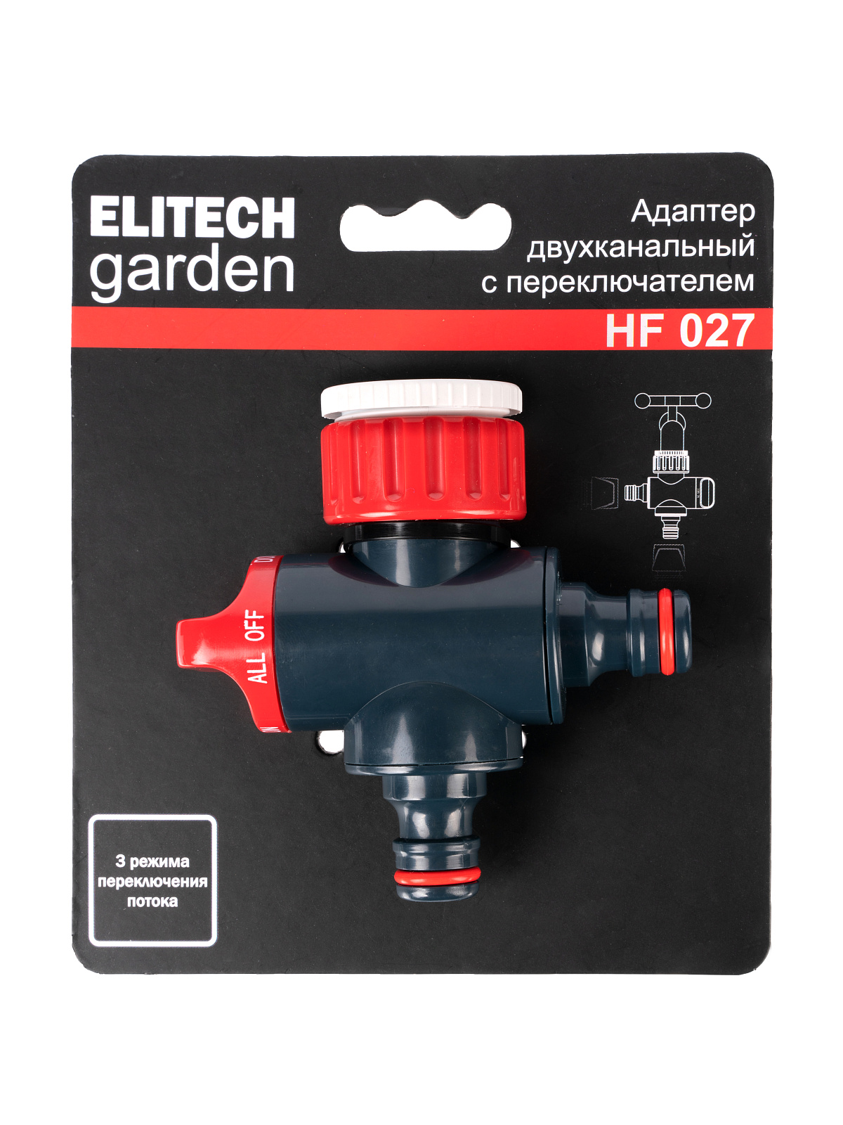 **Адаптер двухканальный HF 027 Elitech Garden** используется для подключения двух шлангов к стационарным водным магистралям (краны, водные розетки)