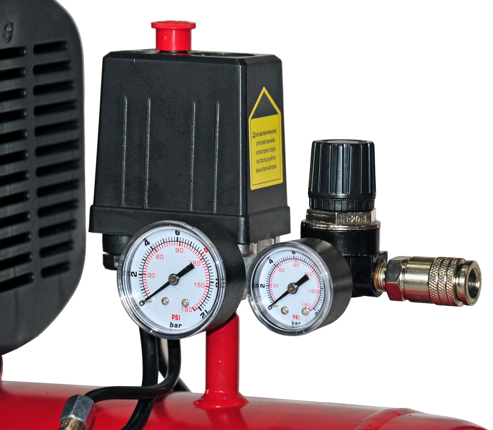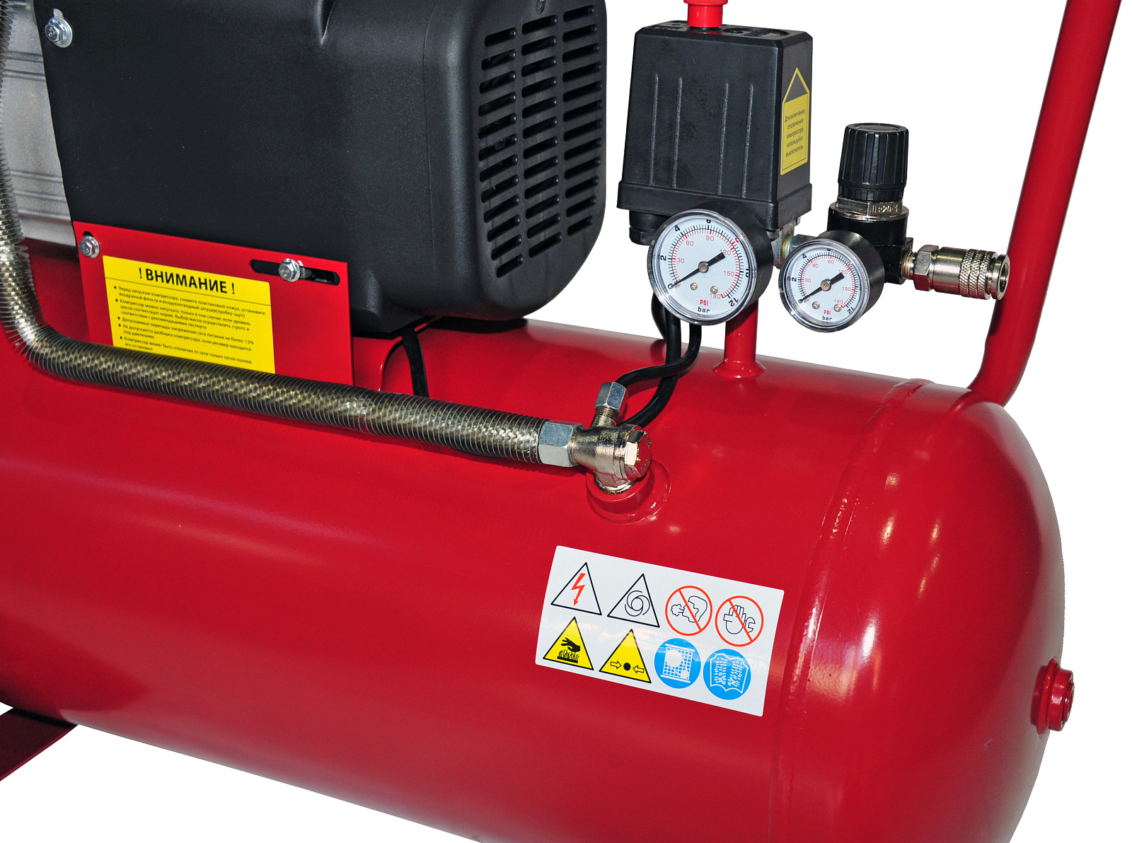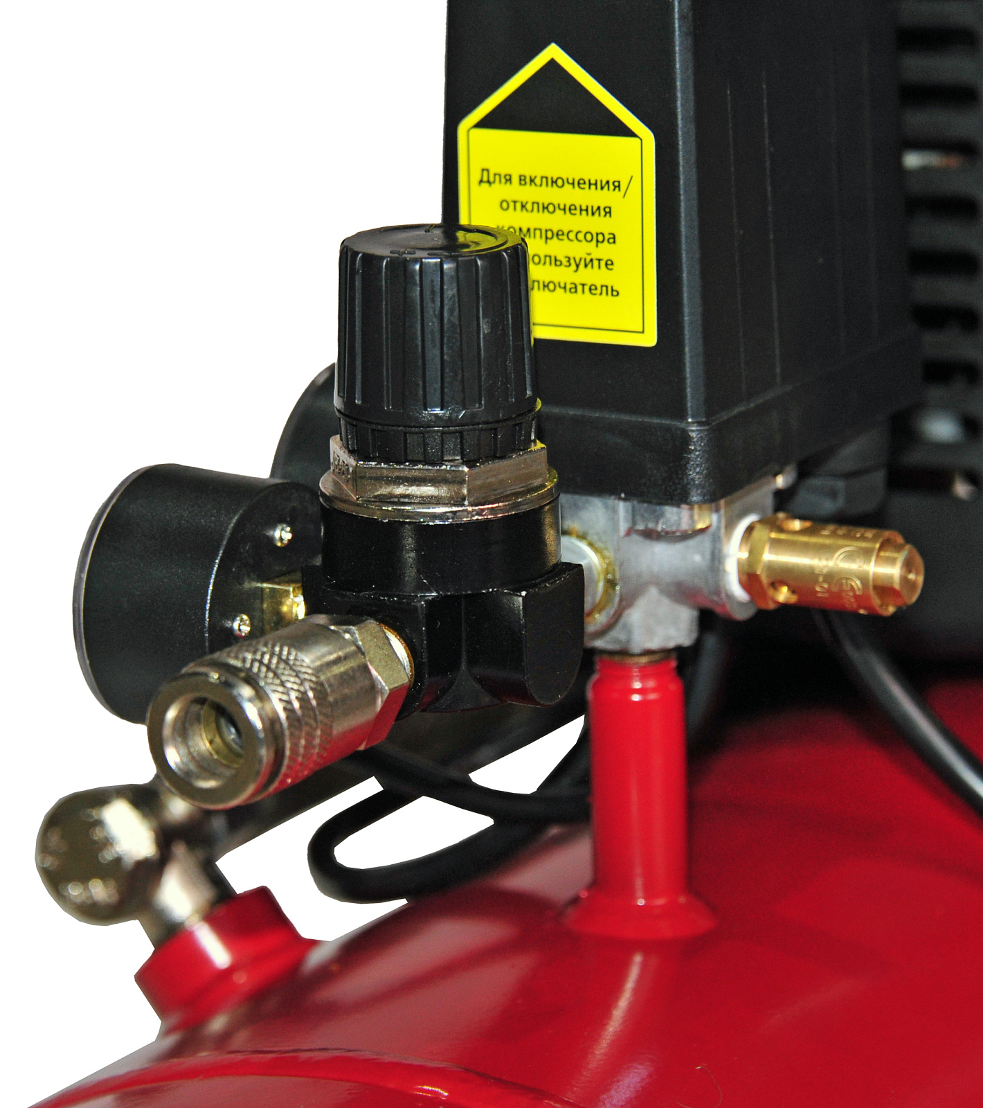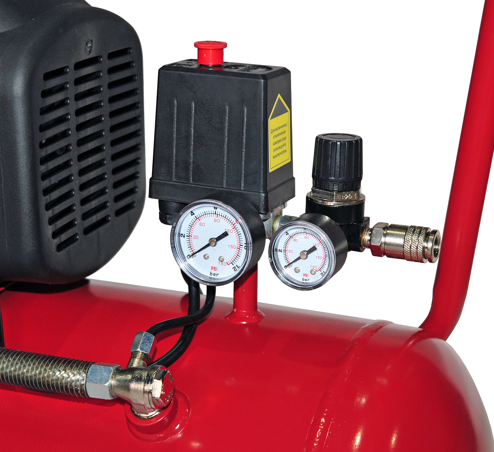 На компрессор установлен синхронный (щеточный) двигатель, быстросъемный разъем «рапид», два манометра для контроля давления в ресивере и на выходе, выходной редуктор для регулировки давления воздуха на выходе. Есть блок автоматического управления давлением, визуальный контроль уровня масла.