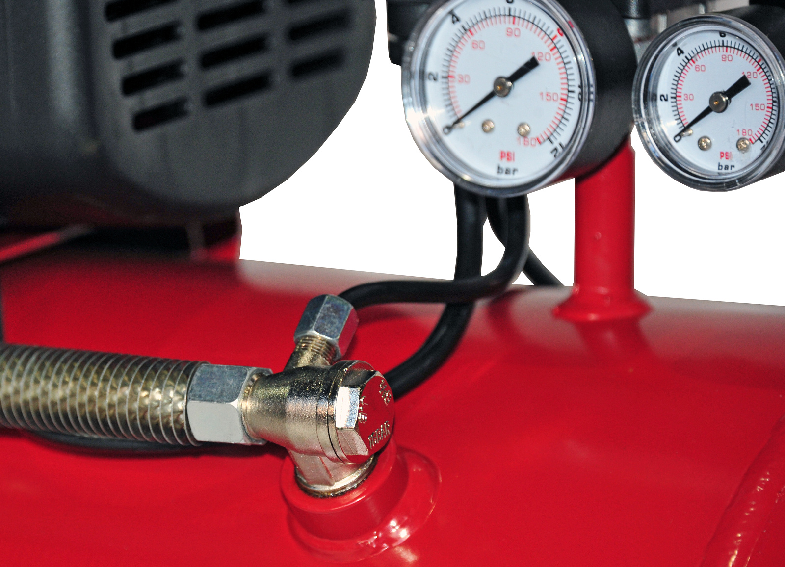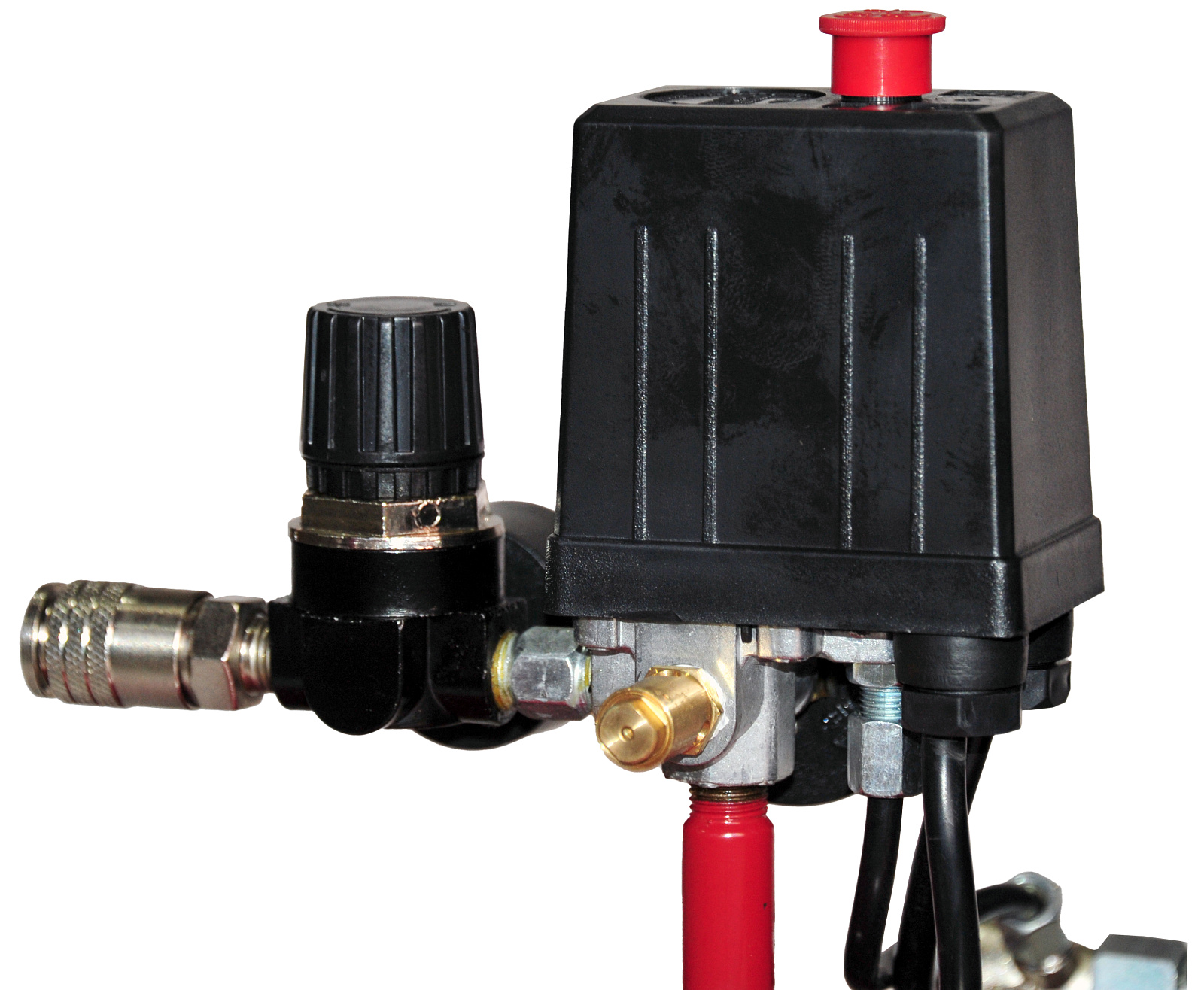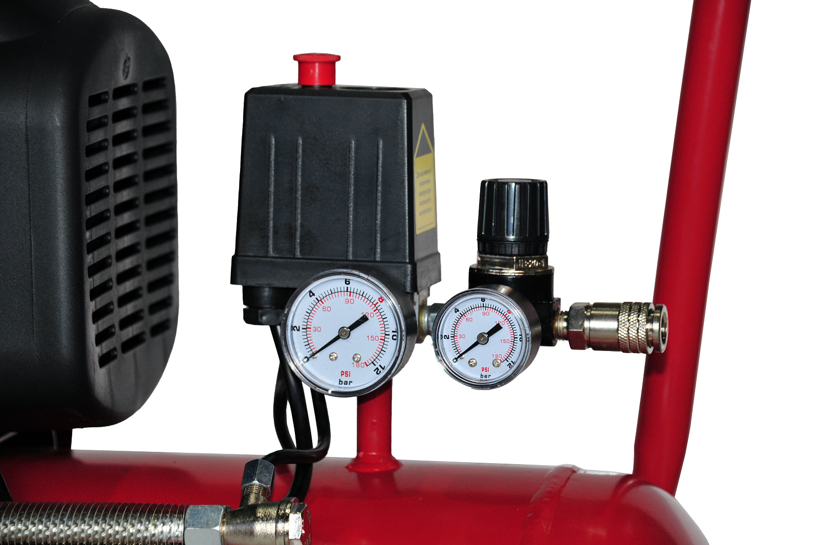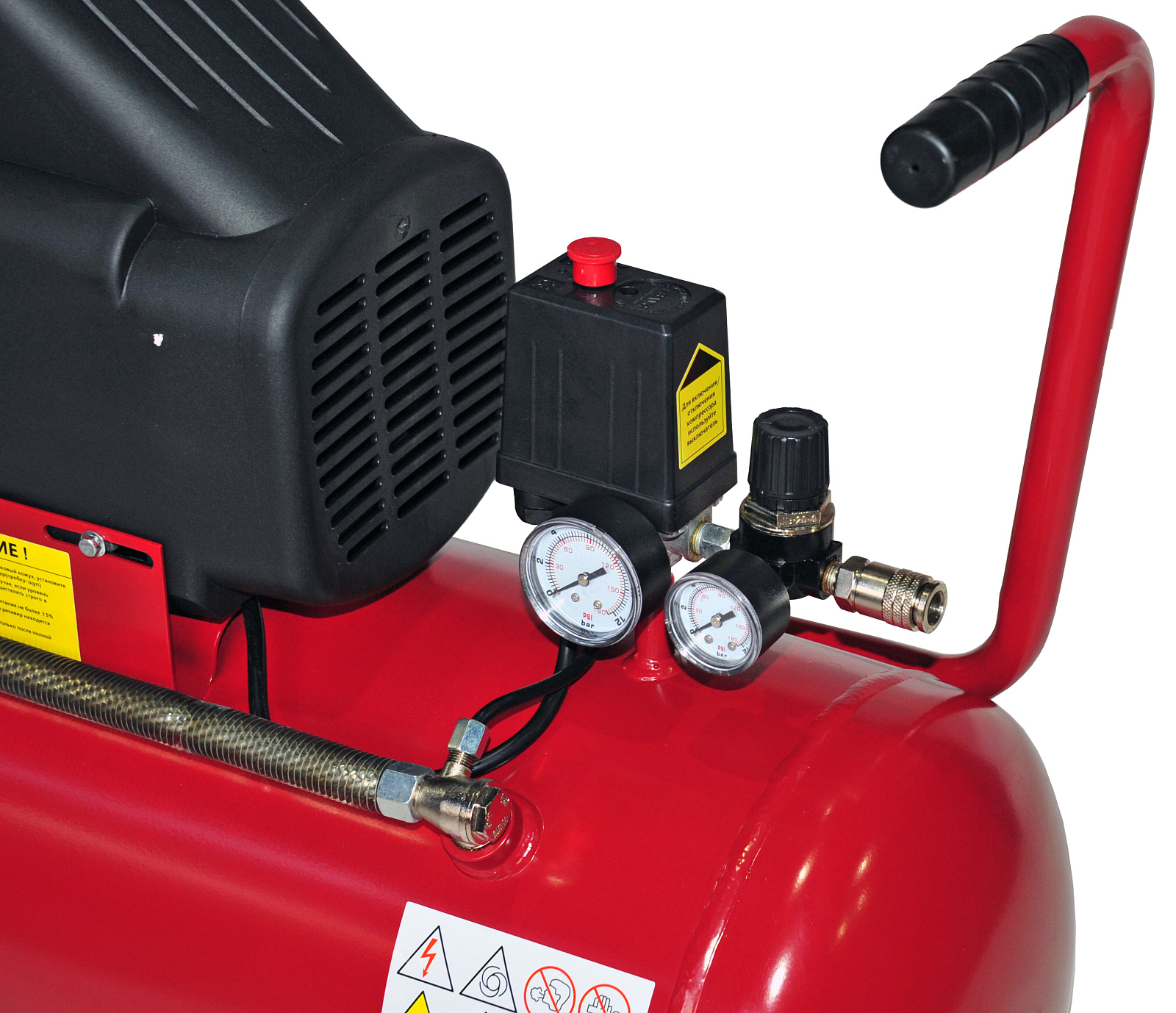 На компрессор установлен синхронный (щеточный) двигатель, быстросъемный разъем «рапид», два манометра для контроля давления в ресивере и на выходе, выходной редуктор для регулировки давления воздуха на выходе. Есть блок автоматического управления давлением, визуальный контроль уровня масла.
