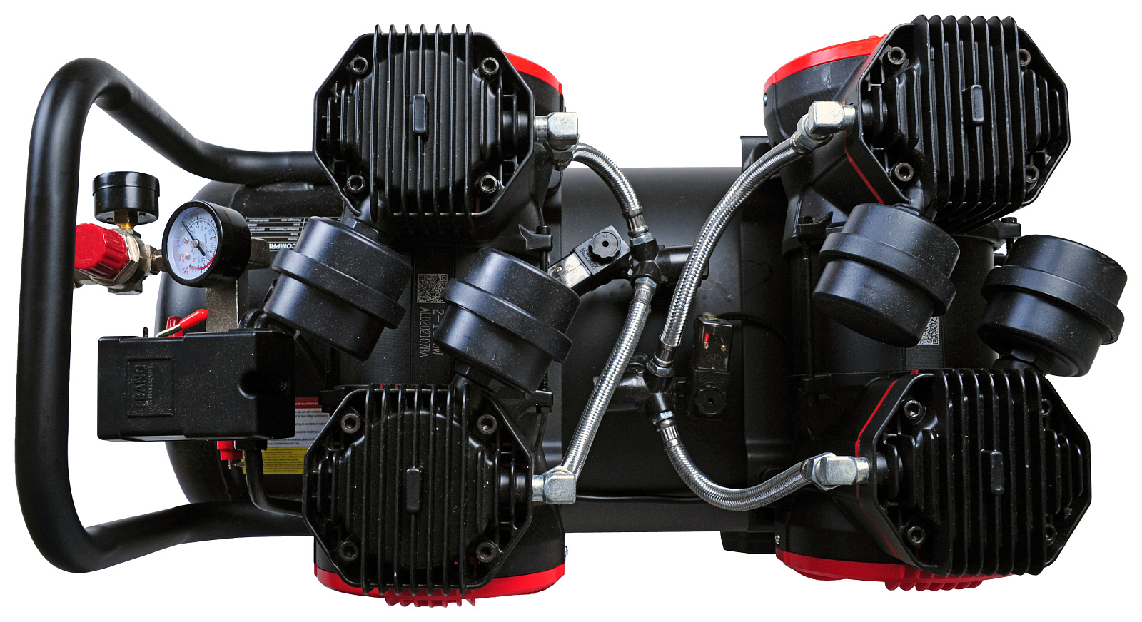 Коаксиальный безмасляный малошумный компрессор с ресивером на 50 литров. Два выхода. Быстросъемный разъем рапид и елочка 8мм с вентилем. Регулировка давления на выходе. Два асинхронных двигателя. Четыре поршневых блока. Два манометра для контроля давления в ресивере и на выход.