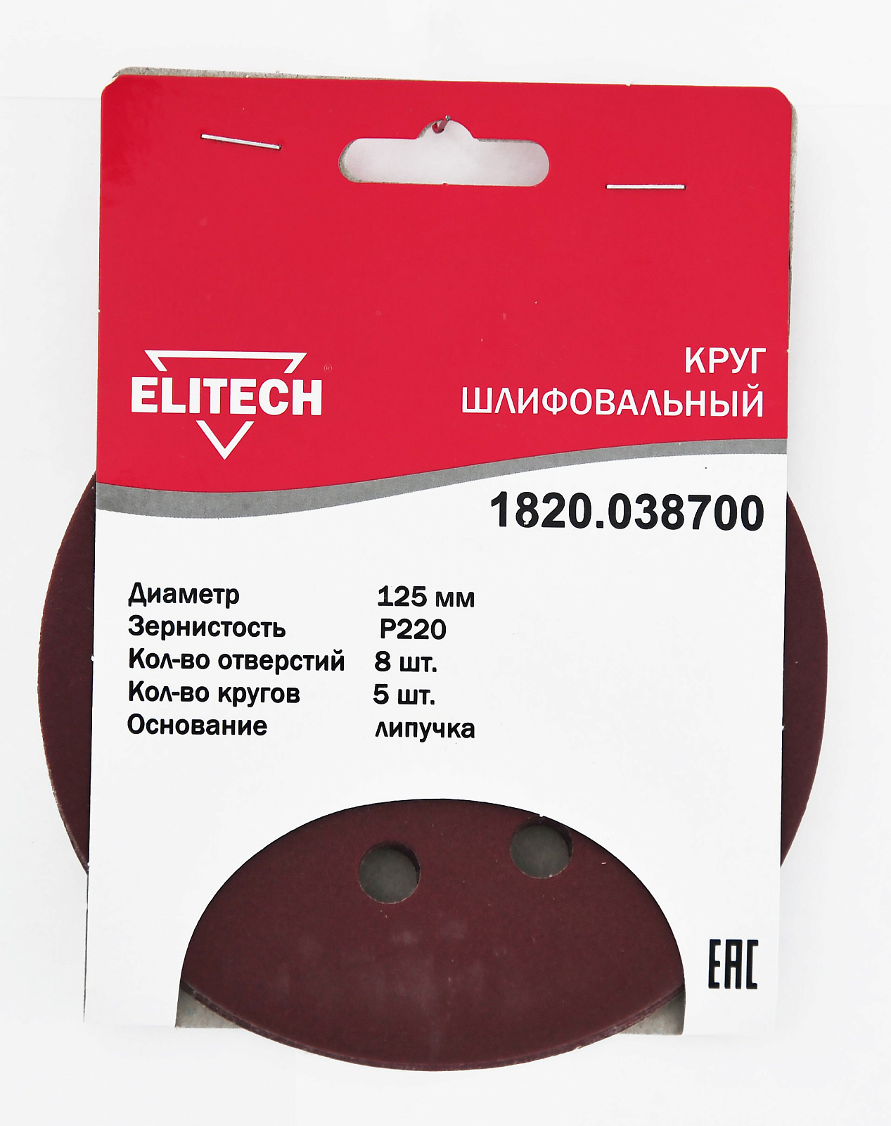 Шлифкруг,липучка,8отв,ф125мм,P220,5шт,для дерева и металла.